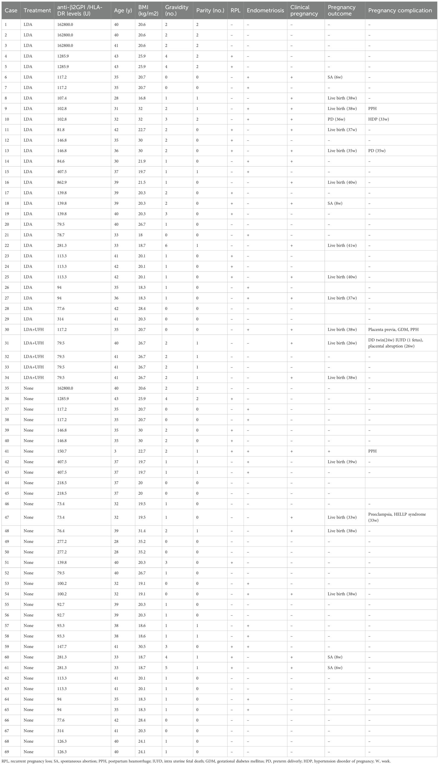 Table 2. Treatment modalities and pregnancy outcomes per each embryo transfer in women tested positive for anti-β2GPI/HLA-DR antibody.