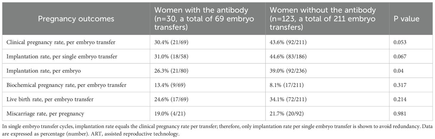 This study has several limitations. First, the samples of women with infertility who tested positive for anti-β2GPI/HLA-DR antibodies and treatment subgroups were small. Despite multivariable analyses adjusting for background factors, the statistical power to evaluate treatment effects remains limited; thus, the estimates should be interpreted with caution. Second, treatment allocation was based on physician discretion rather than randomization; therefore, residual confounding cannot be completely excluded despite adjustment. Third, embryos were selected according to institutional criteria; however, their morphological quality varied, and PGT-A was not routinely performed, which may have affected outcomes. Although some differences did not reach statistical significance, likely due to the limited sample size, the observed numerical trends may still reflect clinically meaningful differences, as discussed by previous studies highlighting the potential discrepancy between statistical and clinical significance in small samples (29). Importantly, the relationships observed in this study support association with anti-β2GPI/HLA-DR antibody positivity and do not establish causality or therapeutic efficacy. Thus, future large-scale, multicenter randomized trials or well-controlled prospective studies with standardized embryo selection and SET protocols are warranted to validate our findings and test causality and elucidate the mechanisms linking anti-β2GPI/HLA-DR antibodies to ART outcomes.