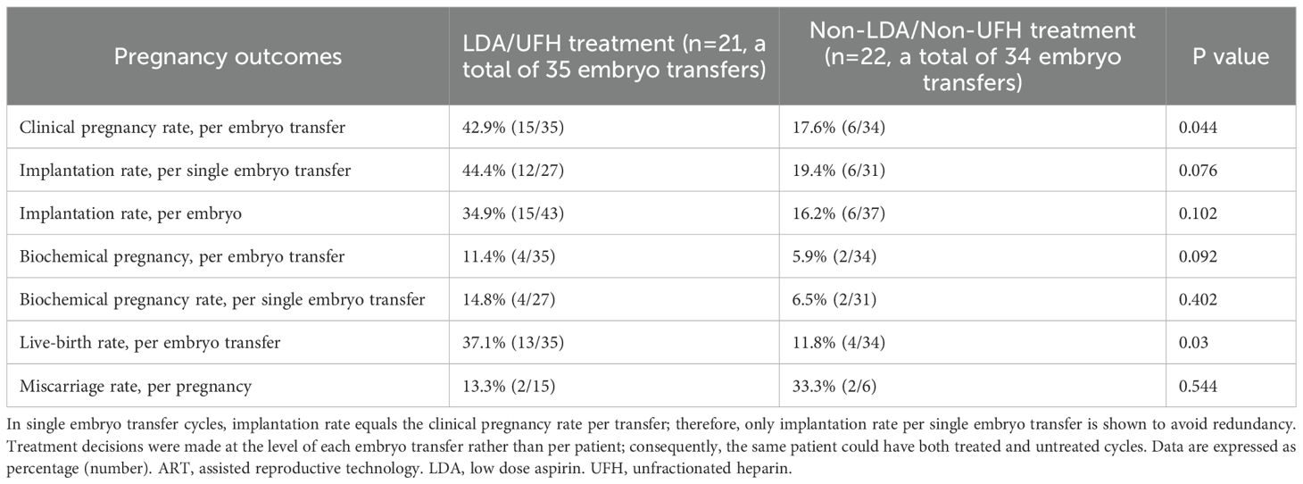 Conclusion: LDA/UFH treatment may be associated with higher clinical pregnancy and live-birth rates in women positive for anti-β2GPI/HLA-DR antibodies receiving ART.