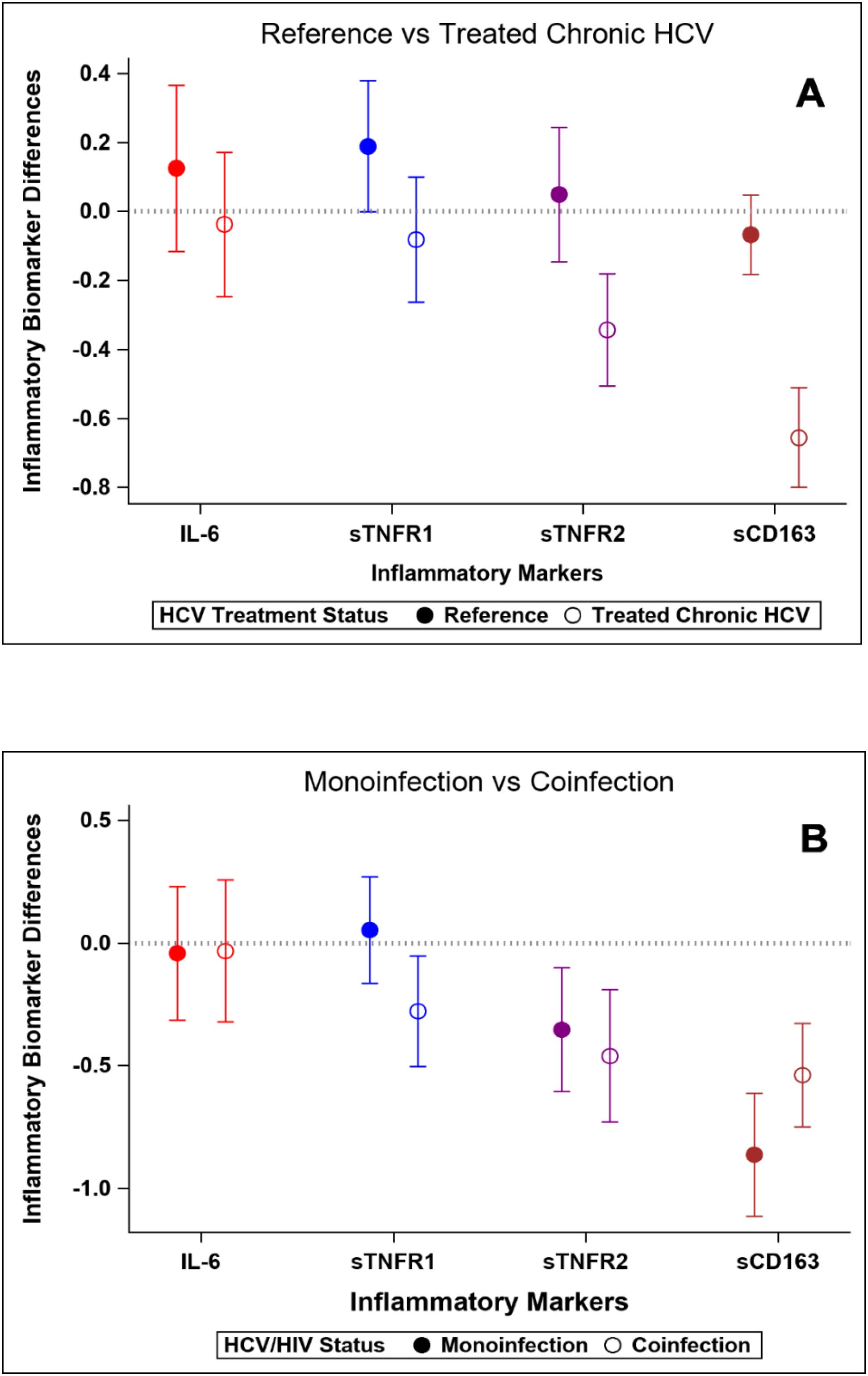 Figure 1. Changes in standardized inflammatory markers over the study interval. Y-axis values represent standardized mean change over time. Positive values indicate greater increase (or smaller decrease) compared to reference group. (A) Reference population vs HCV-infected group. (B) HCV mono-infected group vs HIV-HCV co-infected group.