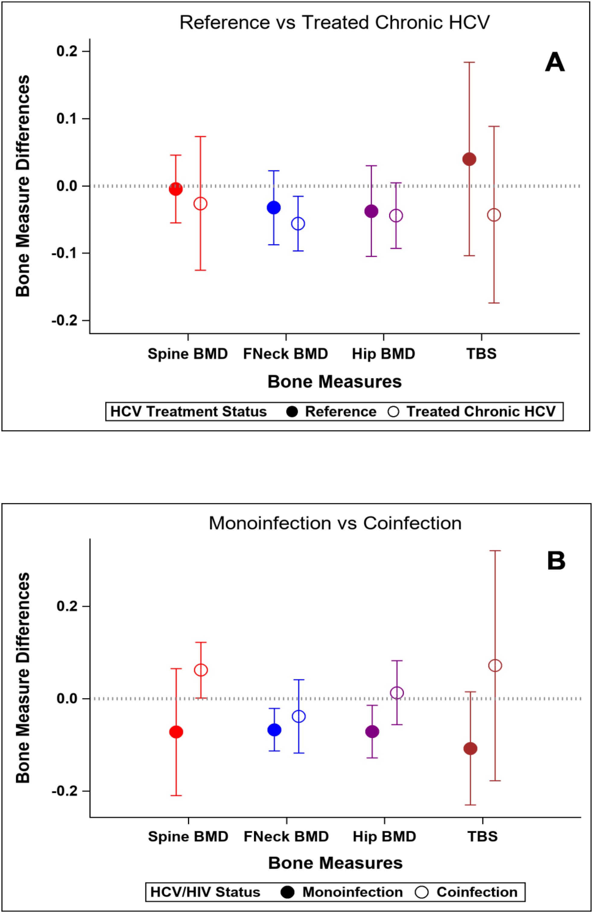 Figure 2. Changes in standardized bone measures over the study interval. Y-axis values represent standardized mean change over time. Positive values indicate greater increase (or smaller decrease) compared to reference group. (A) Reference population vs HCV-infected group. (B) HCV-monoinfected group vs HIV-HCV co-infected group.