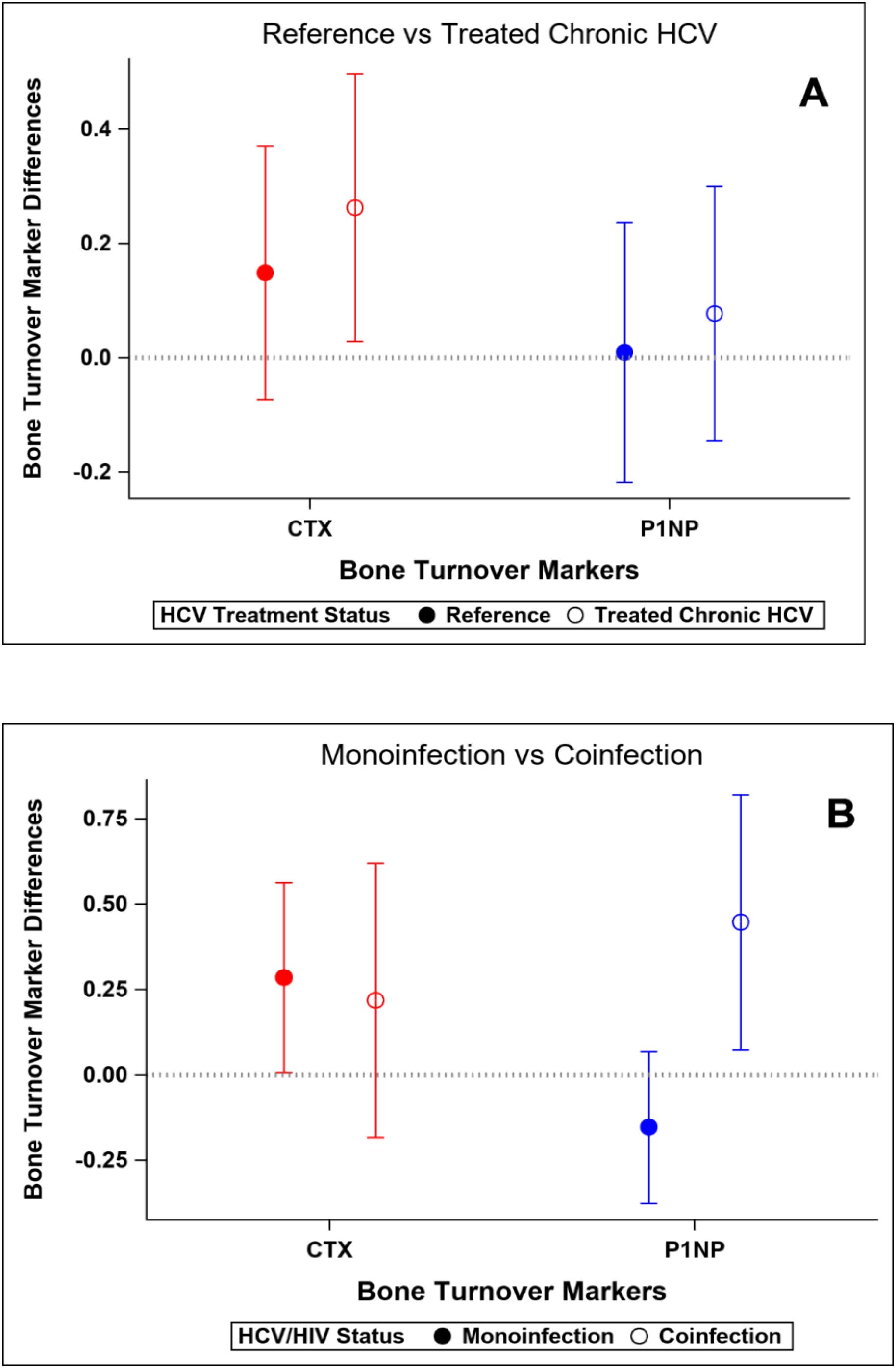 Figure 3. Changes in standardized bone turnover markers over the study interval. Y-axis values represent standardized mean change over time. Positive values indicate greater increase (or smaller decrease) compared to reference group. (A) Reference population vs HCV-infected group. (B) HCV mono-infected group vs HIV-HCV co-infected group.