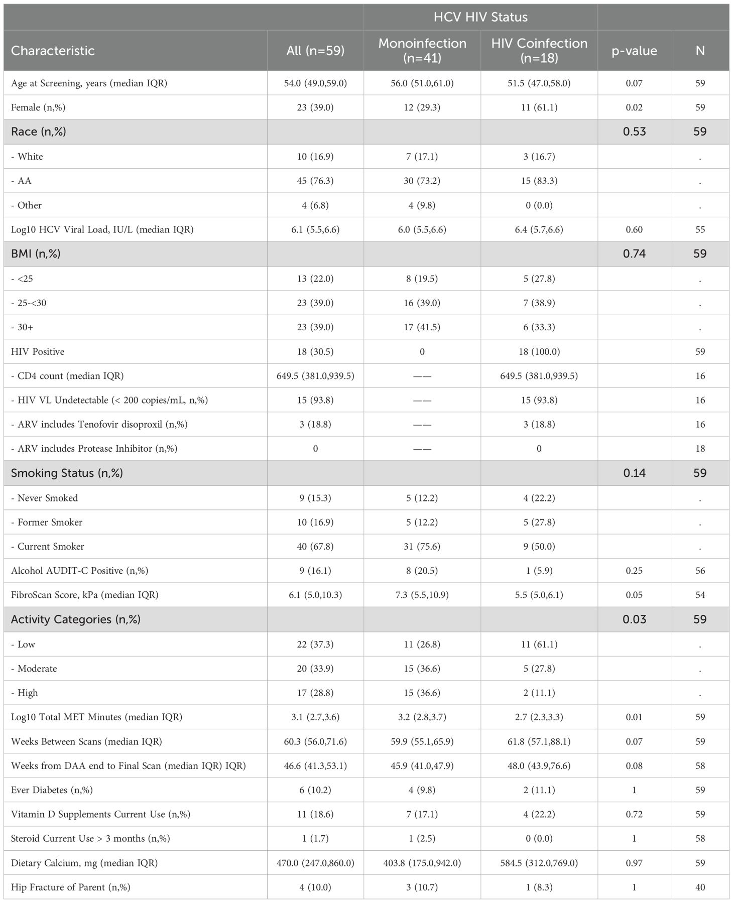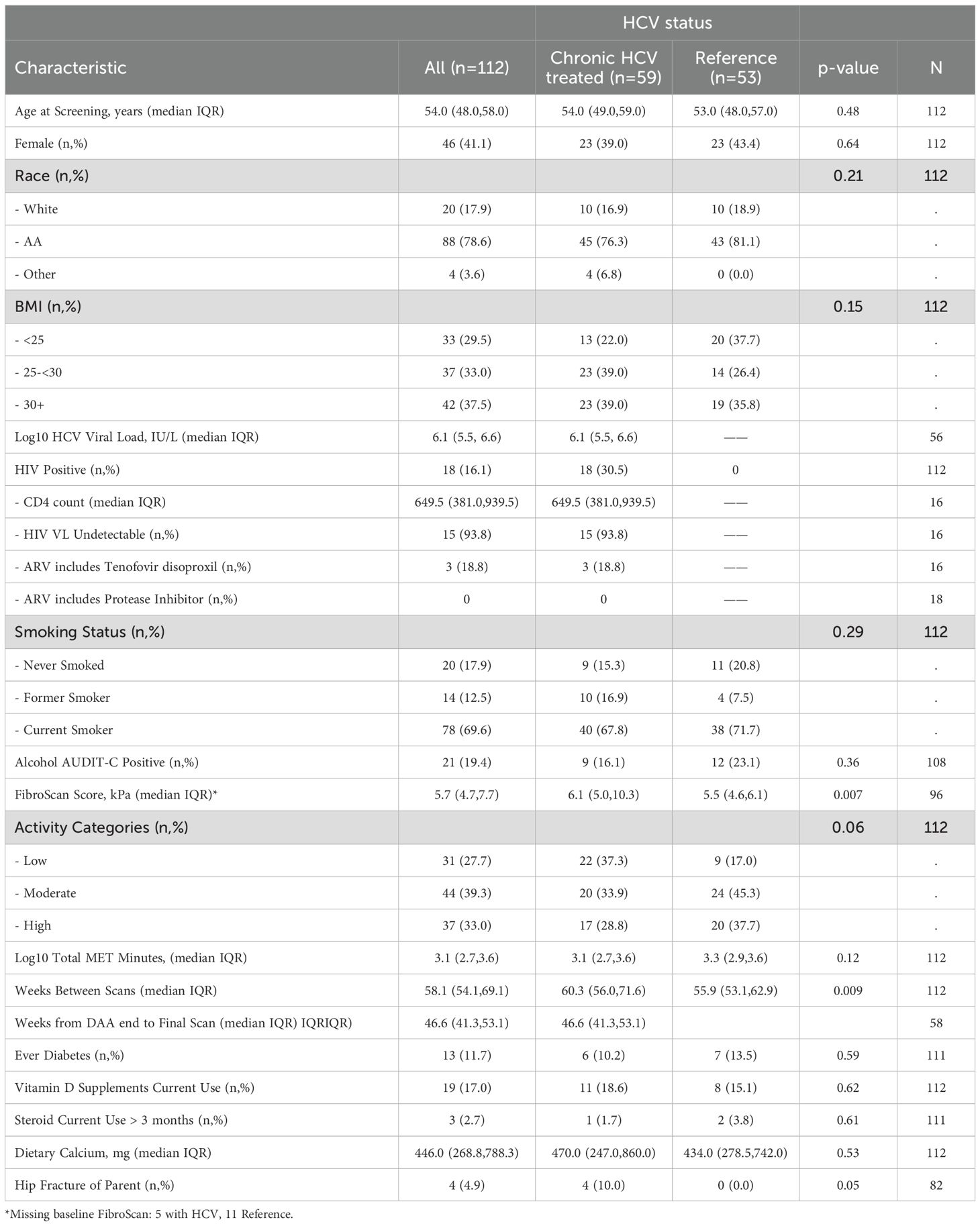 Between October 2016 and November 2020, adults with chronic HCV infection who intended to receive curative treatment with DAA were recruited into a longitudinal study from the local infectious disease clinics in Baltimore, Maryland, USA. During the same period, adults without HIV infection (negative antibody testing within 6 weeks) or HCV infection (negative HCV antibody or undetectable HCV viral load without HCV treatment) were recruited from local clinics, from friends and family of participants, and by word of mouth to serve as a reference population. This reference population was frequency matched to those with HCV infection by age, race, and sex. Persons with weight > 300 pounds (weight limit of densitometer), with a history of receiving osteoporosis treatment, with a history of prior DAA use, or with a history of end-stage liver or kidney disease were excluded. All persons provided informed consent, and the study was approved by the Johns Hopkins School of Medicine Institutional Review Board.