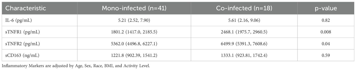 At baseline, sTNFR1 and sTNFR2 concentrations were higher in participants with HIV/HCV co-infection than those with HCV mono-infection, whereas IL-6 and sCD163 concentrations were similar in the two groups (Table 4). After HCV cure, sTNFR1 significantly decreased in those with HIV/HCV co-infection compared to those with HCV mono-infection (p-value=0.04 for difference in slopes between the two groups) (Figure 1B). We also observed a trend to a greater decrease in sCD163 concentrations in the HCV monoinfected group, compared to those with HIV/HCV co-infection (p=0.051) (Figure 1B).