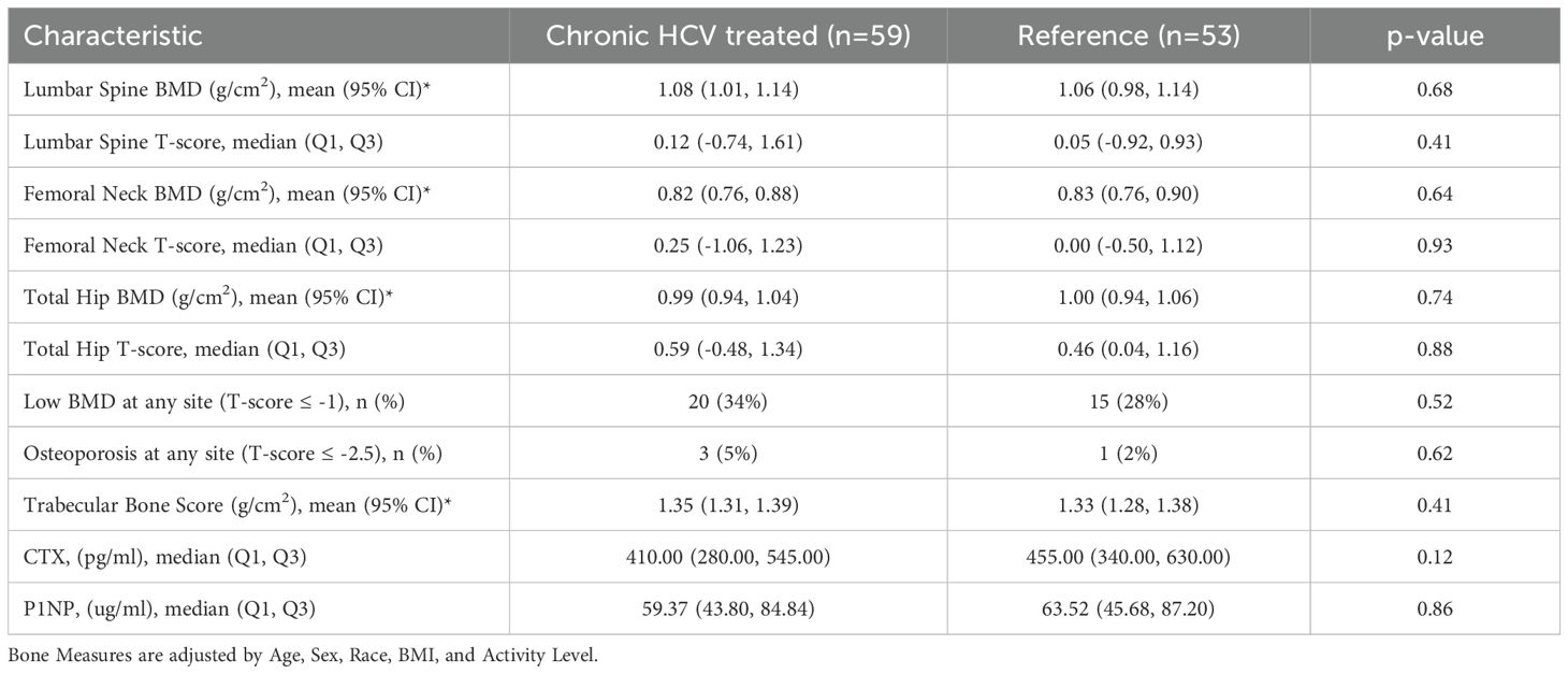 Results: The group with HCV (41 mono-infected, 18 people with HIV/HCV co-infection) had a median age of 54 years; 61% were male and 76% were African American. Population characteristics were similar in the reference group (n=53). At baseline, soluble receptor for TNFα 1 and 2 (sTNFR-1/sTNFR-2) and sCD163 concentrations, but not interleukin-6, were higher in participants with HCV infection compared to the reference group. After a median follow-up period of 60 weeks, HCV cure was associated with decreases in sTNFR1, sTNFR2 and sCD163 concentrations. However, we observed no statistically significant changes in BMD, TBS or BTM after HCV treatment compared to the reference population. Among those with HCV, participants with HIV co-infection showed a significant increase in the bone formation marker P1NP (p<0.007) and trends toward greater increases in LS and TH BMD (p<0.08 for both) after HCV cure.