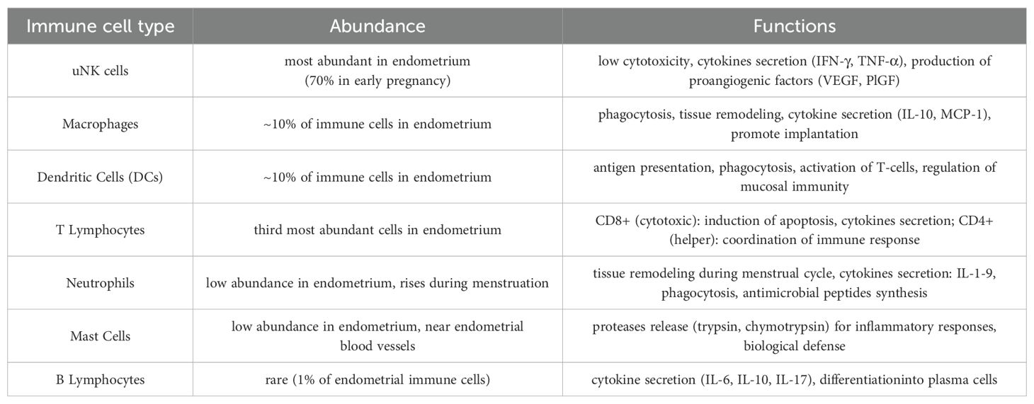The immune system plays a crucial role in maintaining homeostasis within the female URT, protecting it from pathogens and preventing pathological changes (Figure 2). Although immune cells are distributed differently across various regions of the reproductive system (Table 1), the most abundant are T lymphocytes, dendritic cells (DCs), natural killer (NK) cells, neutrophils, and mast cells which collectively orchestrate tissue remodeling, immune surveillance, and regulation of local inflammation, particularly during the secretory phase of the menstrual cycle. Dominance of these particular immune cells within the endometrium suggests that the immune landscape of this niche is predominantly shaped by cellular immunity, with innate immune cells constituting the majority of leukocyte populations. In contrast, humoral immunity plays a supplementary role, with low numbers of B lymphocytes and plasma cells producing limited amounts of secretory IgA and IgG in the endometrial milieu. This cellular predominance ensures rapid and localized immune responses while maintaining immune tolerance required for successful implantation (45).