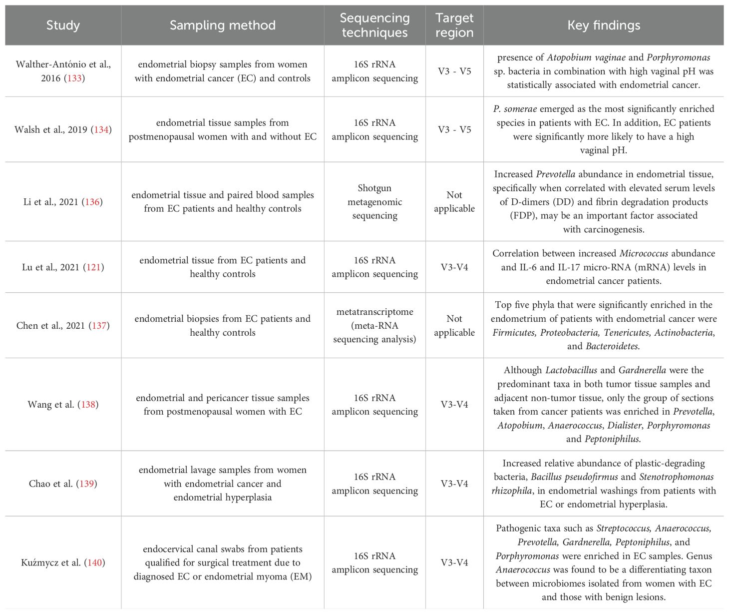 The correlation between endometrial dysbiosis and endometrial cancer is indicated by the results of studies from the last decade (Figure 5). The link between the occurrence of EC and the presence of specific bacterial strains within the altered tissues was first demonstrated by Walther-António (133). The experiment was conducted on a group of 17 women who had undergone a hysterectomy for an established cancer. The results of next-generation sequencing of the 16S rDNA V3-V5 region revealed that the presence of Atopobium vaginae and Porphyromonas sp. bacteria in combination with high vaginal pH was statistically associated with endometrial cancer.