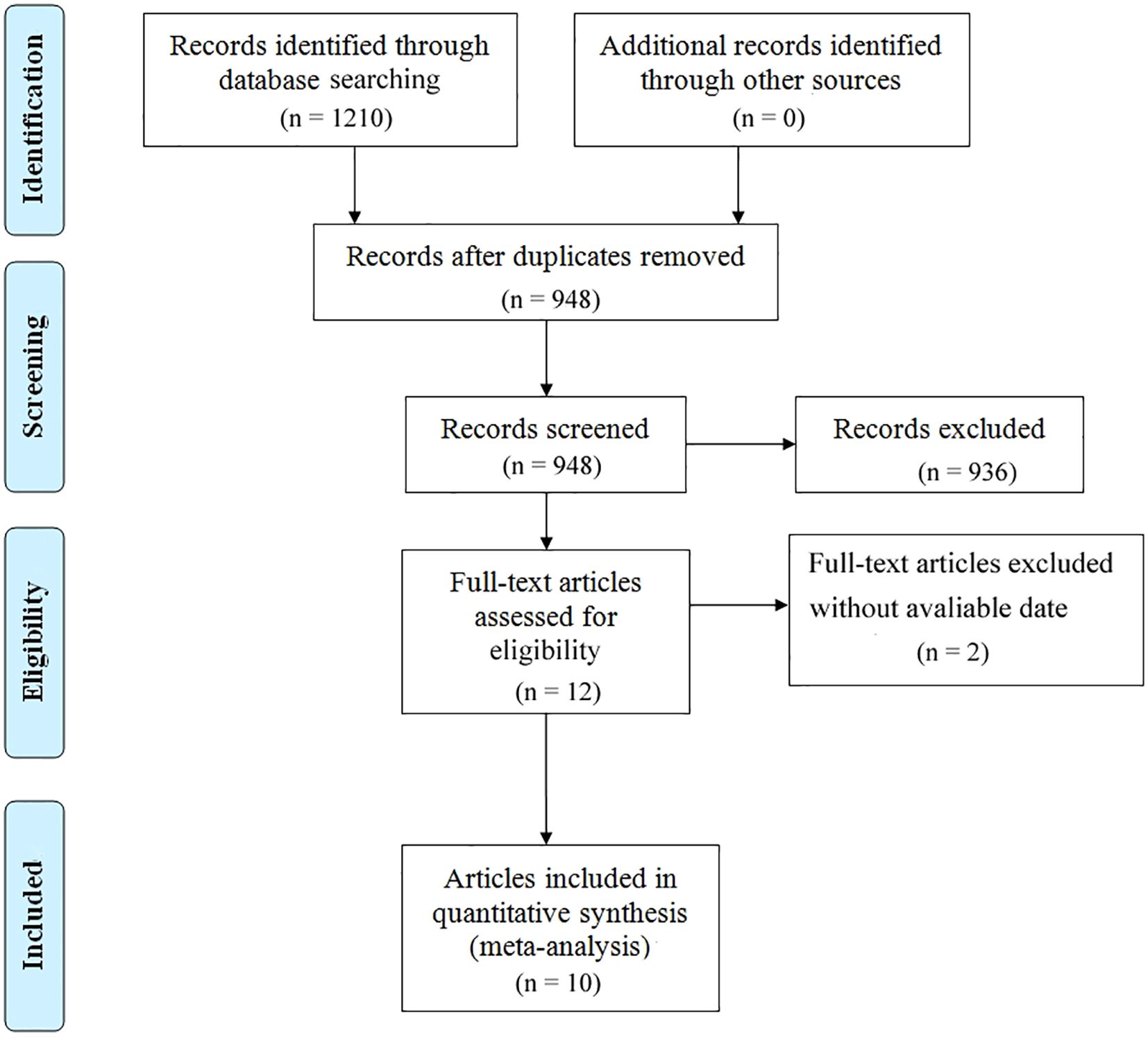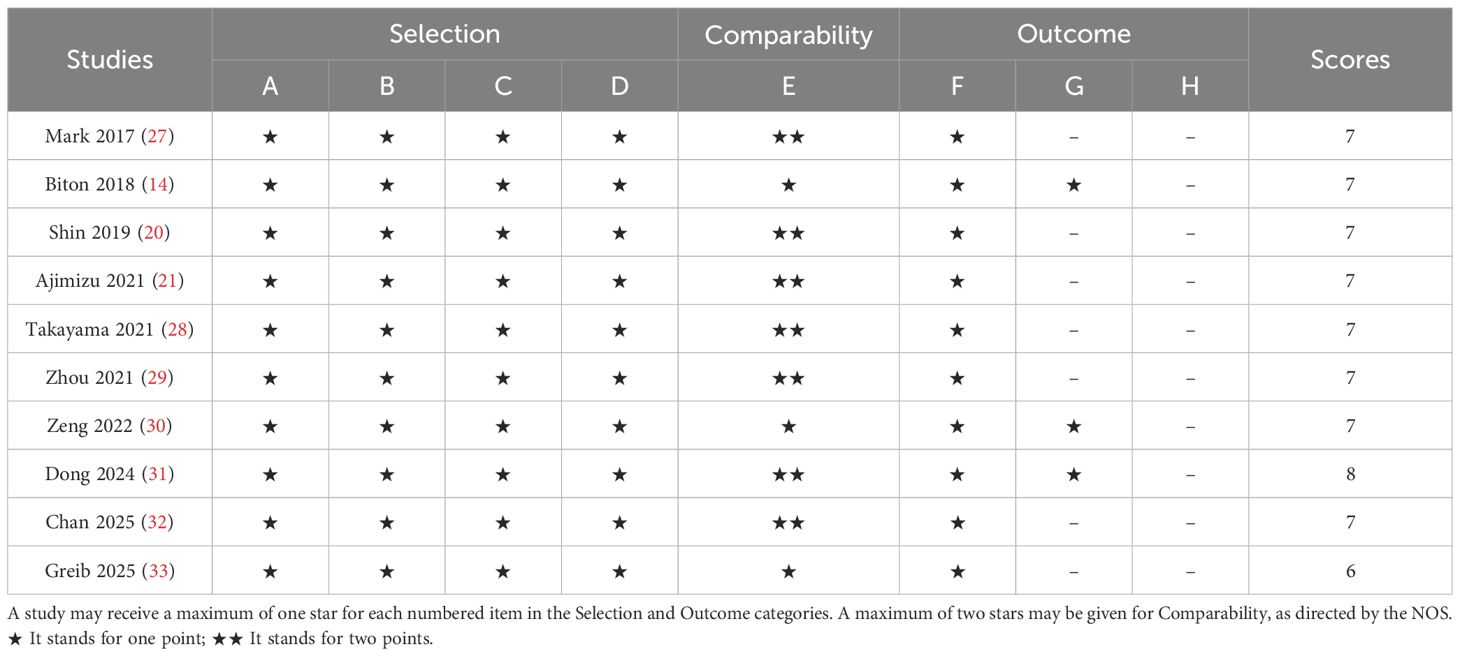 The literature selection protocol is detailed in Figure 1. An initial search across multiple academic databases yielded 1,210 records. Following the removal of 262 duplicates, 948 unique articles were retained for preliminary evaluation. Titles and abstracts of these records were systematically reviewed using predefined eligibility criteria, leading to the exclusion of 936 entries deemed irrelevant or non-compliant. Subsequently, full-text assessments were conducted on the remaining 12 articles, of which 2 were excluded due to insufficient data availability. In the final phase, 10 high-quality studies were incorporated into the meta-analysis (14, 20, 21, 27–33). A comprehensive overview of the selected studies is provided in Figure 1. The included studies, spanning publication years from 2017 to 2025, were conducted across diverse geographic regions, including the United States, Japan, China, France, Korea, and Canada. Cohort sizes exhibited substantial variation, ranging from 30 participants (Dong 2024) to 2,326 patients (Chan 2025), collectively representing multiple cancer subtypes, predominantly non-small cell lung cancer (NSCLC). Among these investigations, six studies evaluated survival outcomes (OS and/or PFS) in relation to PD-1/PD-L1 inhibitors, while three analyses incorporated combination therapies involving CTLA-4 inhibitors. Temporal follow-up periods ranged from a median of 18 months to over 80 months, with five studies reporting incomplete follow-up data (marked as NR). Detailed demographic characteristics, including age distributions (mean ± SD: 50–83 years) and gender disparities (male predominance: 53.9%–98.5% across cohorts), are systematically cataloged in Table 1. As shown in Table 2, the methodological quality assessed using the Newcastle-Ottawa Scale (NOS) was consistently high, with eight of the included studies scoring 7/9 and one study obtaining the maximum score of 8.