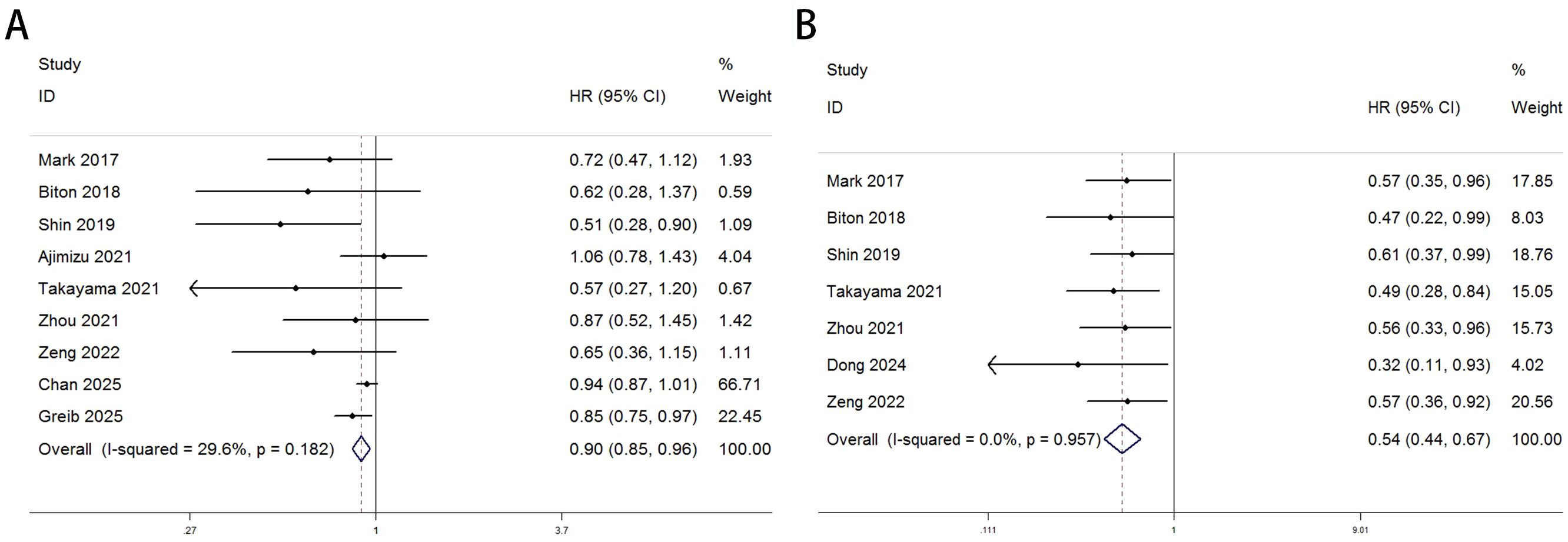Heterogeneity test results indicated that neither OS (Figure 2A: I² = 29.6%, p = 0.182) nor PFS (Figure 2B: I² = 0.0%, p = 0.957) analyses reached significant heterogeneity thresholds (I² < 50%, p > 0.1), supporting the use of a fixed-effects model for data integration. The pooled results from 9 studies (OS) and 7 studies (PFS) demonstrated significant differences in survival outcomes between lung cancer patients with COPD and those without COPD following PD-1/PD-L1 inhibitor therapy. For OS analysis (Figure 2A), the hazard ratio (HR) for the COPD group was 0.90 (95% CI: 0.85–0.96, p < 0.001), indicating a statistically significant improvement in OS compared to the non-COPD group. Individual study HR distributions revealed that Shin 2019 (HR = 0.51, 95% CI: 0.28–0.90) and Greib 2025 (HR = 0.85, 95% CI: 0.75–0.97) contributed notably to the overall effect, accounting for 1.09% and 22.45% of the weight, respectively. Notably, the confidence intervals for Biton 2018 (HR = 0.62, 95% CI: 0.28–1.37) and Takayama 2021 (HR = 0.57, 95% CI: 0.27–1.20) crossed the null value (HR = 1), suggesting potential limitations in sample size or follow-up duration (>80 months). For PFS analysis (Figure 2B), the COPD group exhibited a pooled HR of 0.54 (95% CI: 0.44–0.87, p < 0.001), further supporting the association between COPD and superior PFS. Among these, Dong 2024 (HR = 0.32, 95% CI: 0.11–0.93) and Takayama 2021 (HR = 0.49, 95% CI: 0.28–0.84) demonstrated the most pronounced effect sizes, contributing 4.02% and 15.05% of the weight, respectively. The exclusion of the null value (HR = 1) in all confidence intervals indicated consistent results across studies. We performed subgroup analyses based on region (Asia vs. others), sample size of the COPD-positive group (≤70 vs. >70), treatment type (PD-1 inhibitor, PD-1/PD-L1 inhibitors, or ICIs broadly), and statistical method (univariate vs. multivariate analysis) to further evaluate the impact of comorbid COPD on survival outcomes among lung cancer patients treated with immune checkpoint inhibitors. As shown in Table 3, subgroup analysis of overall survival (OS) indicated that patients with COPD showed particularly improved outcomes in the following subgroups: those from non-Asian regions (HR = 0.91, p = 0.004), those in studies with larger sample sizes (COPD+ >70, HR = 0.92, p = 0.007), those receiving PD-1 inhibitor monotherapy (HR = 0.58, p = 0.004), and those analyzed using univariate methods (HR = 0.83, p = 0.001).Similarly, Table 4 shows that progression-free survival (PFS) was significantly improved among COPD patients across all subgroups, with especially pronounced benefits observed in Asian populations (HR = 0.54, p < 0.001), studies with smaller sample sizes (COPD+ ≤70, HR = 0.56, p < 0.001), patients treated with PD-1 inhibitors (HR = 0.52, p = 0.001), and those analyzed using multivariate methods (HR = 0.56, p < 0.001).