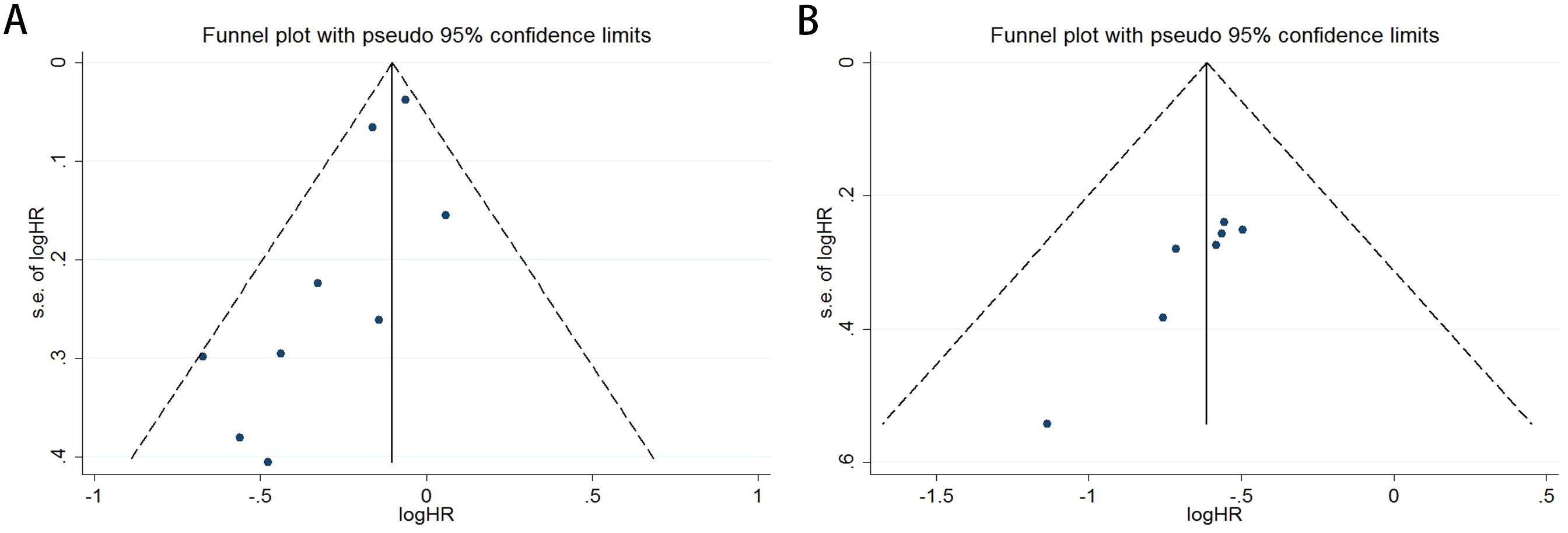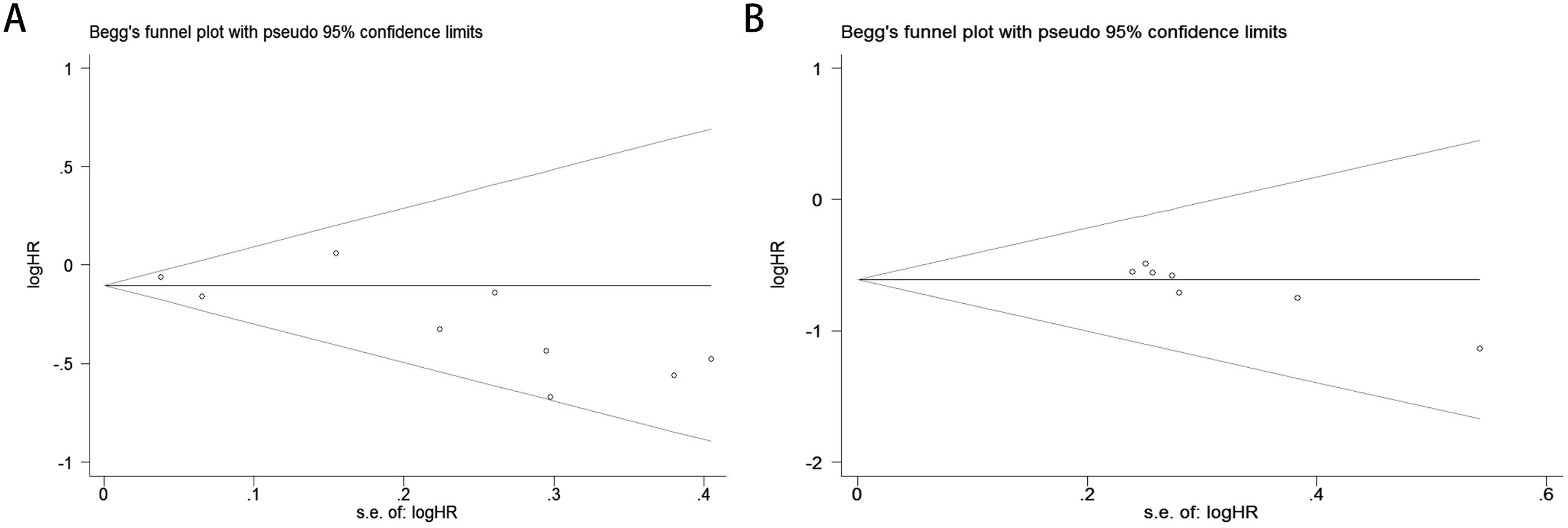 Figure 4. Publication bias assessment. (A) Begg’s test for OS (p = 0.118); (B) Begg’s test for PFS (p = 0.016).