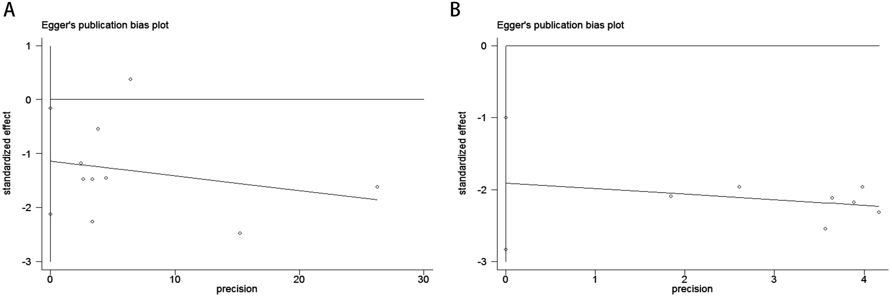 Figure 5. Publication bias assessment. (A) Egger’s test for OS (p = 0.504); (B) Egger’s test for PFS (p = 0.003).