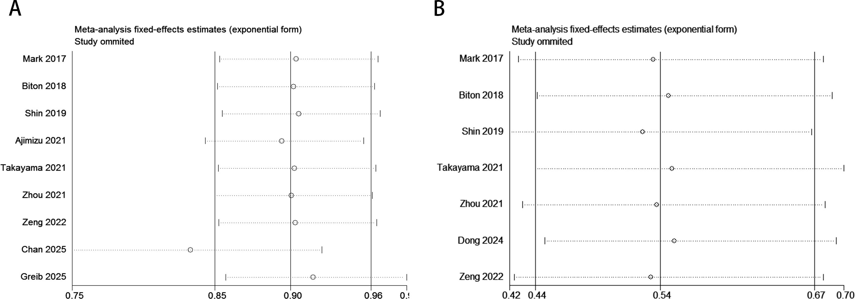 The sensitivity analysis revealed that omitting specific studies (e.g., Chan 2025 or Greib 2025 with HR = 0.98) might significantly reduce the pooled HR for OS, suggesting a dilution effect of these studies on the overall results and potentially weakening the survival benefit conclusion of ICIs in the current meta-analysis (Figure 6A). In contrast, for PFS, even after excluding outliers (e.g., Mark 2017 with HR = 0.42), the pooled HR remained stable within the 0.44–0.70 range without crossing the null threshold (HR = 1). All studies consistently demonstrated significant PFS improvement, validating the robust and uniform efficacy of ICIs in delaying disease progression (Figure 6B).