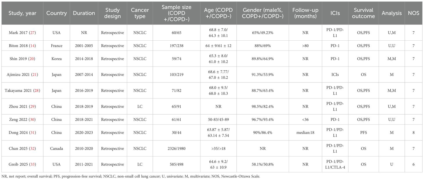 Data extraction was performed independently by two researchers, who extracted the following information from the included studies: first author, publication year, country, study design (retrospective/prospective), histological type of lung cancer (NSCLC/SCLC), diagnostic criteria for COPD (GOLD staging or pulmonary function indices), sample size (COPD group vs. non-COPD group), baseline patient characteristics (median age, gender distribution), immunotherapy regimens (PD-1/PD-L1 monotherapy or combination therapy), follow-up period (months), survival outcomes (OS, PFS), and their corresponding hazard ratios (HR) with 95% confidence intervals (CI). Study quality was assessed using the Newcastle-Ottawa Scale (NOS) for observational studies, focusing on three domains:(1)Selection of participants (0–4 points): Whether COPD (e.g., confirmed by pulmonary function tests) and lung cancer histology were clearly defined, and whether confounding factors (e.g., smoking history, COPD severity) were controlled via matching or multivariate analysis.(2)Comparability between groups (0–2 points): Balance in prognostic factors (e.g., age, cancer stage, PD-L1 expression) between COPD and non-COPD groups.(3)Outcome assessment (0–3 points): Blinding in survival endpoint adjudication and follow-up completeness (lost-to-follow-up rate <20%). The total score ranges from 0 to 9. Studies scoring above 6 points were classified as high quality (26). Any discrepancies were resolved through discussion or consultation with a third researcher.