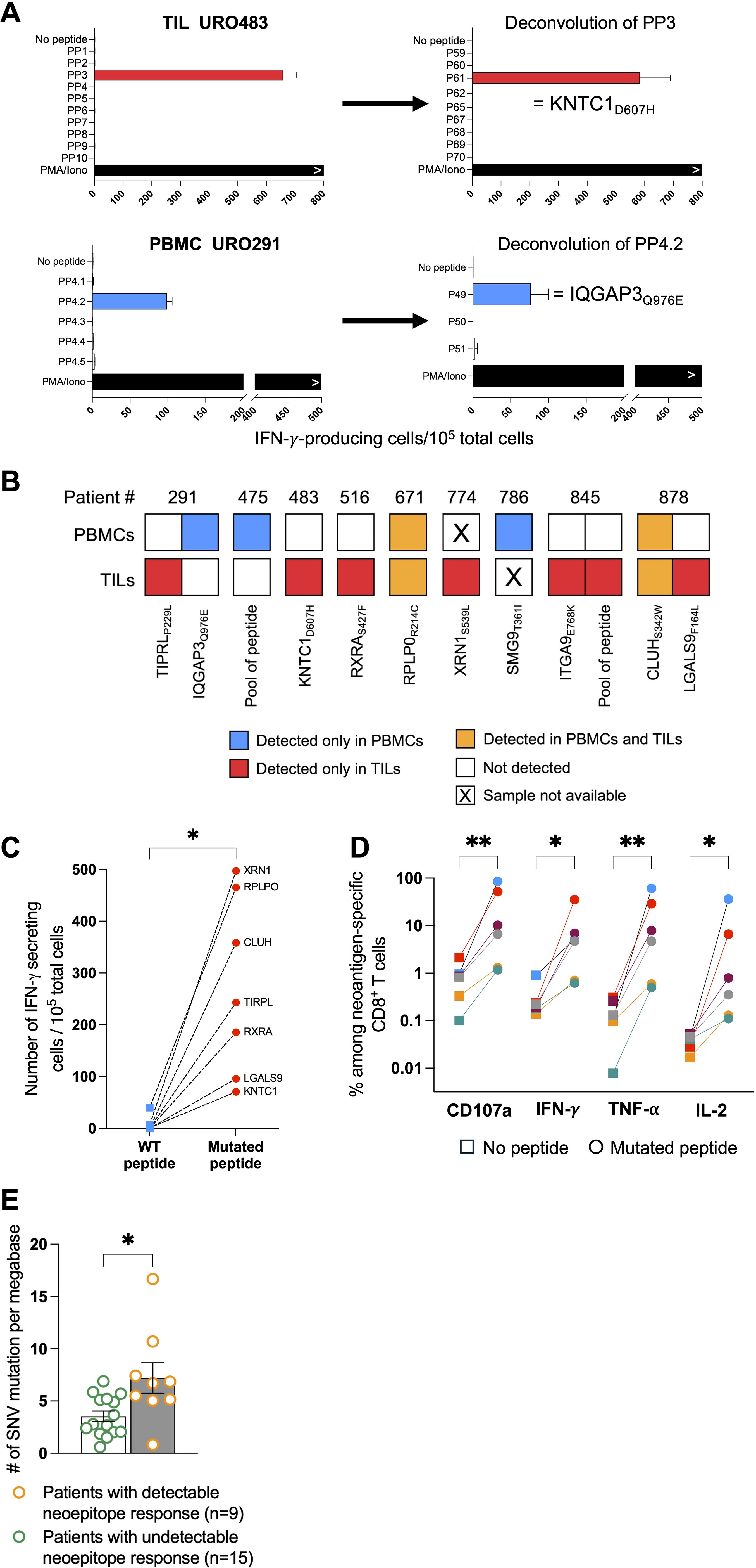 Figure 1. Identification of neoepitope-specific T cells in TILs and PBMCs from bladder cancer patients. (A) Representative examples of deconvolution of peptide pools in TILs or PBMCs from two patients (URO483 and URO291). (B) Neoepitope repertoire from the 9 patients with neoantigen reactivities. Each colored square represents one neoepitope for which CD8+ T-cell reactivity was observed either exclusively in PBMCs (blue), exclusively in TILs (red) or in both compartments (orange). (C) CD8+ T-cell reactivity from TILs or PBMCs measured by IFN-y ELISpot against neoepitope (red dot) and wild-type (WT) non-mutated peptide (blue dot). (D) CD107a, IFN-y, TNF-α and IL-2 production measured by intracellular labelling upon neoepitope stimulation by TILs from 6 patients (one color per patient). (E) Total single-nucleotide variant (SNV)-mutational burden in patients with or without detectable neoepitope-specific CD8+ T-cell responses in TILs or PBMCs. Indicated P values were determined by Wilcoxon t-test (C, E) and one-way ANOVA (D). Significant differences between paired groups are indicated by *p < 0.05 and **p < 0.01. PP, peptide pool.