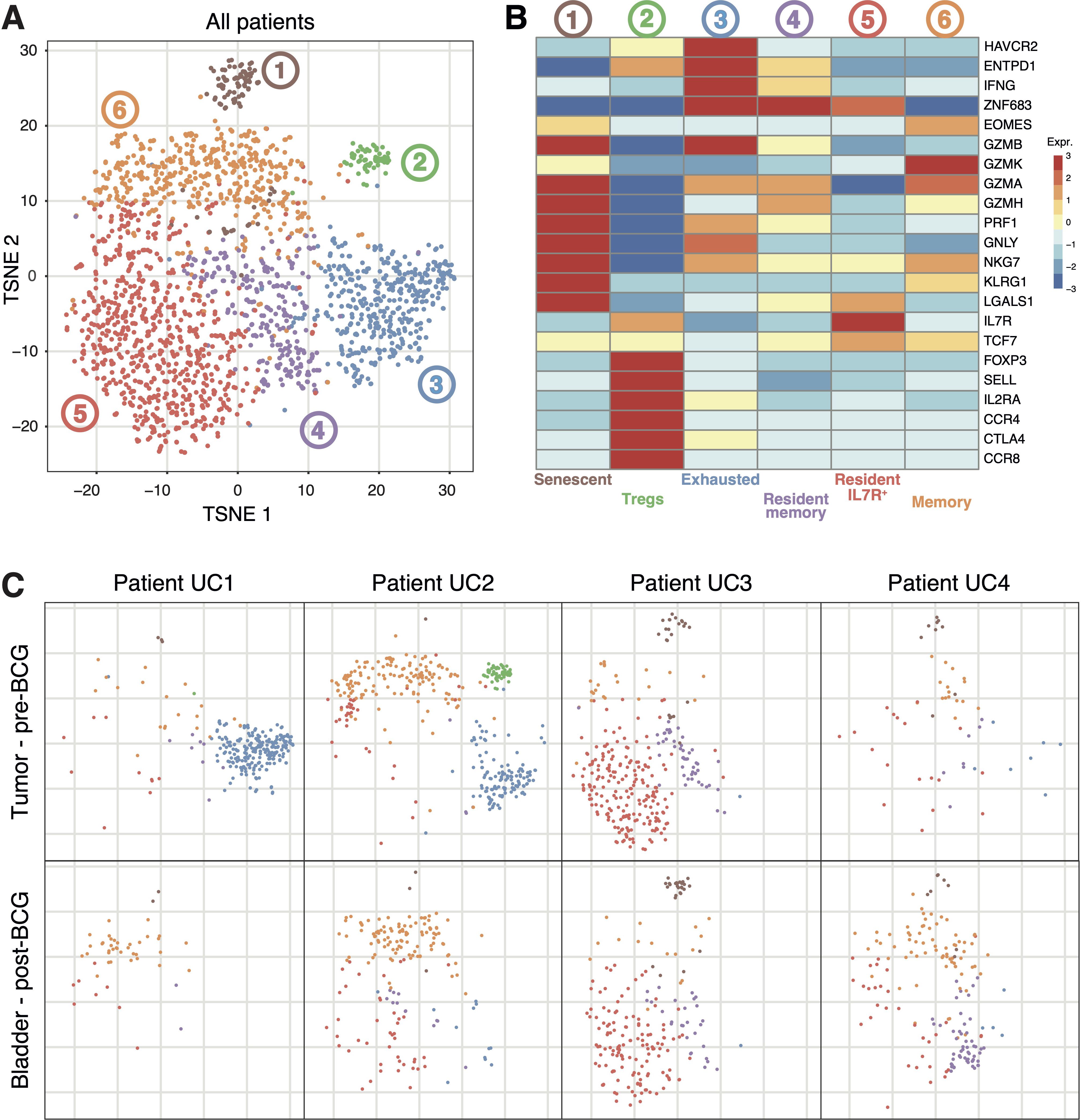 Figure 2. Transcriptomic profiles of CD8+ T cells extracted from the bladder of patients UC1 to UC4. (A) T-distributed stochastic neighbor embedding (t-SNE) projection of Smart-Seq2-based CD8+ single-cell data from 2040 CD8+ T cells extracted from the tumors and adjacent bladder tissues collected during TURBT, or from the same bladder regions 6 weeks after the last BCG instillation. (B) Heatmap of CD8+ T-cell clusters from (A) showing representative genes for each cluster. (C) Representations of (A) restricted to the indicated cell populations.