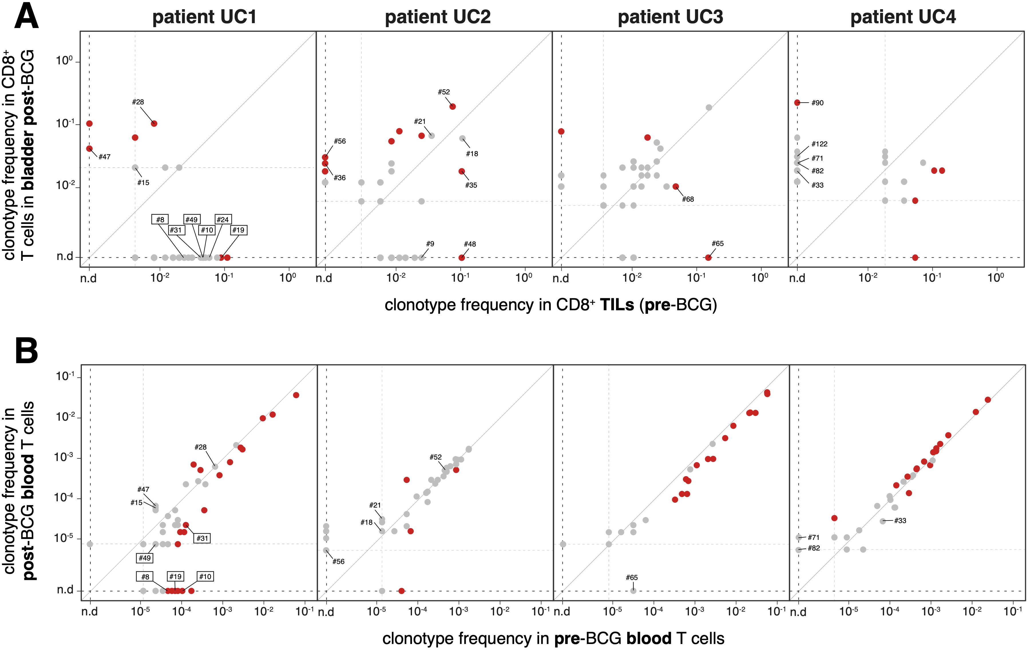 Figure 4. Frequencies of CD8+ T cell clonotypes in bladder and blood, pre- and post-BCG (A) Frequencies of TCR clonotypes were established on the basis of the TRA and TRB sequences identified in the single cell RNA-Seq data. Only clonotypes detected in at least two cells are shown. Those with statistically significant differences between pre-BCG and post-BCG frequencies are indicated in red (Fisher’s exact test, P < 0.05). Clonotypes identified with a number were screened for recognition of mutant peptides and of tumor cDNA library. Lowest frequency thresholds are indicated by dotted lines. For patient UC1 the TCR clonotypes with a demonstrated tumor-specificity are boxed. (B) Frequencies of the same TCR clonotypes in blood before and after therapy, established on the basis of TRB repertoires on blood DNA (Adaptive Biotechnologies).