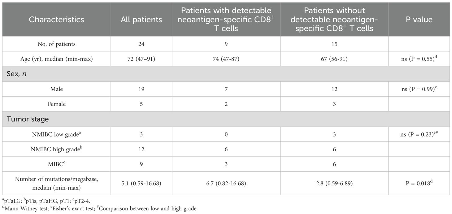 Bladder cancer (BCa) is the 10th most commonly diagnosed cancer worldwide (1). The majority of BCa patients are diagnosed with non-muscle-invasive BCa (NMIBC) and initially undergo transurethral resection of the bladder tumor (TURBT). For high-risk patients (characterized by the presence of carcinoma in situ and/or high-grade Ta/T1 disease), the standard adjuvant treatment consists of repeated intravesical instillations of Bacillus Calmette-Guérin (BCG) once a week for 6 weeks, which reduces both the risk of recurrence (2) and progression to muscle-invasive disease (3). BCa patients can also benefit from immune checkpoint therapy (ICT). PD-L1 blockade is currently the standard maintenance therapy for patients with locally advanced or metastatic bladder cancer who have responded to platinum-based chemotherapy (4). ICT has shown great promise at all stages of the disease, including BCG-unresponsive disease (5), in the neoadjuvant setting (6), and more recently as a first-line treatment for metastatic disease in combination with enfortumab vedotin (7). As in other cancer types, response to ICT is often associated with a high bladder tumor mutation burden, which generates neoepitopes that can be recognized by tumor-specific cytolytic CD8+ T cells (8). One of the key mechanisms of action of ICT is the amplification of pre-existing tumor-specific CD8+ T cells. In BCa, the identification of neoantigen-specific T cells has been poorly investigated, especially in early stages of BCa. Guéguen et al. characterized the first bladder neoantigen-specific CD8+ T cell from the blood of one MIBC patient (9). In addition, Leko et al. analyzed TILs from five patients with non-metastatic bladder cancer and screened them for recognition of predicted neoepitopes. In only one patient, they identified a CD4+ T-cell clone recognizing a peptide encoded by the mutated gene CTBP1Q277R, but no neoepitope-specific CD8+ T cells were detected (10). More recently, spontaneous anti-neoepitope CD8+ T-cell responses have been detected in the blood of 18 out of 24 patients with metastatic BCa (11). However, the prevalence of such responses and their correlation with clinical outcomes in earlier stages of BCa remain unknown.