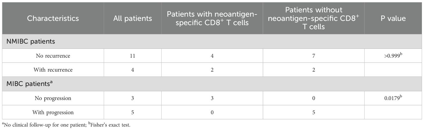 Table 2. Association between the absence of recurrence/progression and the presence of neoantigen-specific CD8+ T cells in MIBC patients.