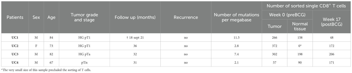Methods: In a first cohort of 15 NMIBC and 9 muscle invasive bladder cancer patients, we used IFN-y ELISPOT assays to screen for the presence of anti-neoepitope CD8+ T cells in the blood, tumor and urine. In a second cohort of 4 NMIBC patients, we analyzed the features and specificity of CD8+ T cells infiltrating the tumoral or bladder tissues before and after BCG using single cell transcriptomic analyses. A total of 31 tumor-infiltrating CD8+ clonotypes were screened against neoepitopes and tumor cDNA libraries.