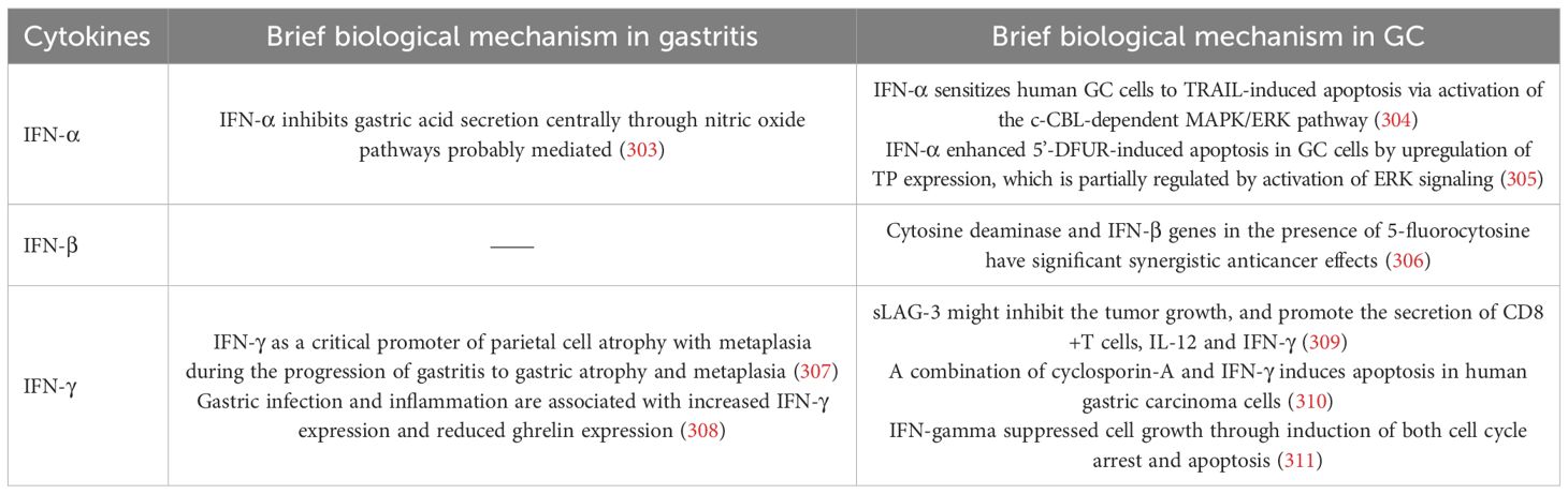 In cancer, the role of ILs is even more complex. ILs can both enhance tumor immunity by modulating immune cell function in the TME (108) and drive tumor progression by promoting immune escape and tumor cell growth (109). Thus, the role of ILs in cancer is a dual one, both protective and potentially aggravating. The specific mechanism of IL in GC and gastritis is detailed in Table 2.