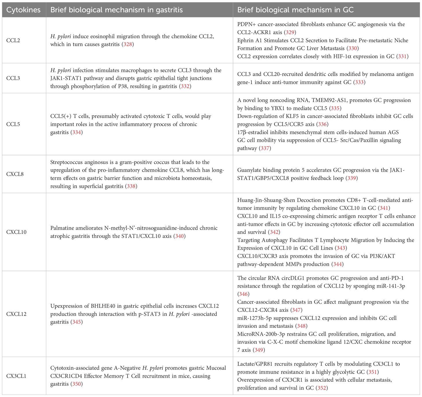 It has been established that IL-12 plays a crucial role in the immune response associated with gastritis, particularly in cases of H. pylori -induced gastritis. As a pro-inflammatory cytokine, IL-12 facilitates the differentiation of CD4+ T cells into Th1 cells, thereby enhancing the production of IFN-γ, which, in turn, accelerates the eradication of H. pylori (249). However, the predominance of this Th1-type immune response can also intensify gastric inflammation, thereby contributing to mucosal damage (250). The persistent inflammation that is driven by IL-12 has been demonstrated to heighten the risk of progression from gastritis to gastric atrophy, and eventually, GC, thereby underscoring its dualistic role in both protecting against infection and contributing to disease progression.