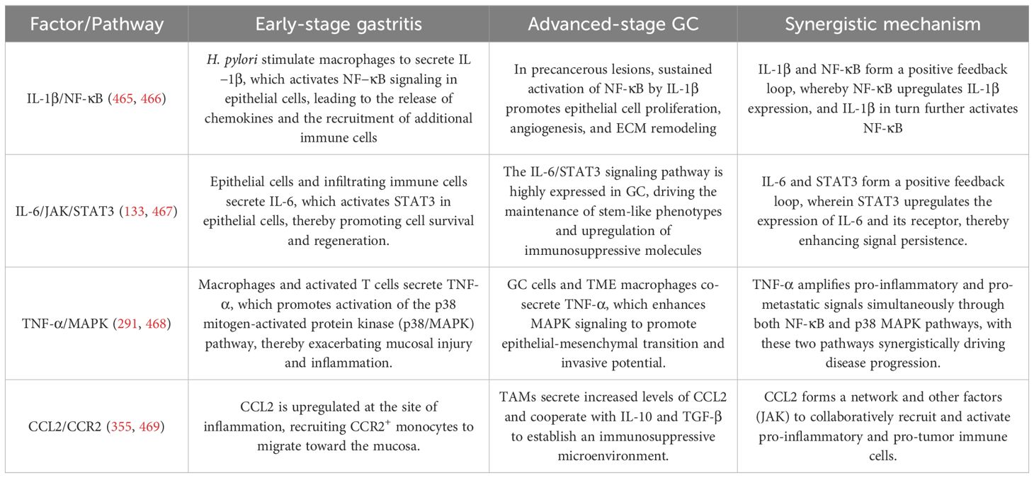 H. pylori infection induces IL-6 secretion, which protects the gastric mucosa from acute inflammation, but long-term IL-6 signaling can lead to chronic inflammation and increase the risk of GC (233). In GC, IL-6 promotes the activation of TAMs and CAFs, which further enhance the inflammatory response by secreting IL-6 and other factors, creating a vicious cycle (227, 234). In addition, IL-6 directly promotes the proliferation, survival, and invasion of tumor cells by activating STAT3 signaling (223).