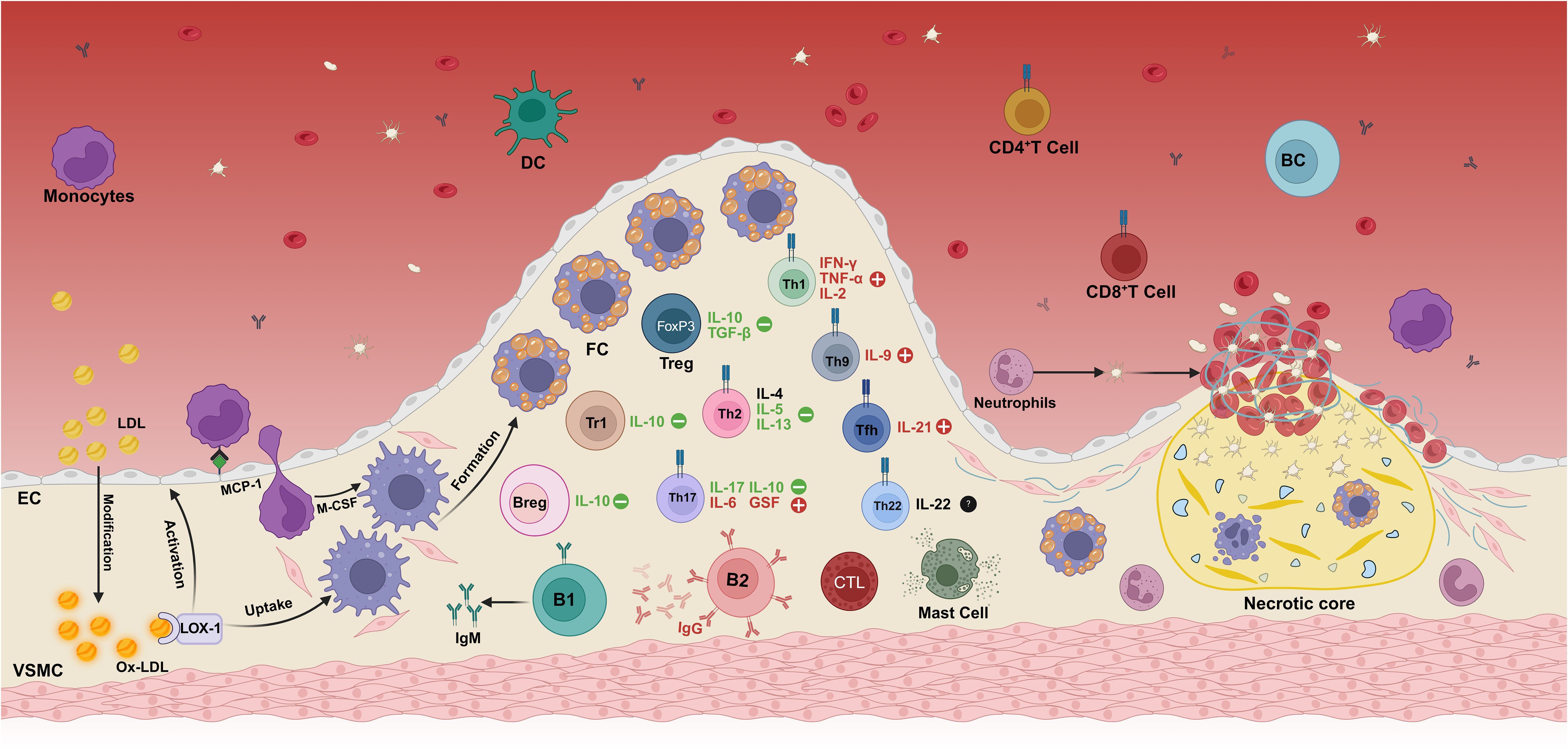 Figure 1. Immunopathogenesis mechanism of atherosclerosis. The deposition of modified oxidized low-density lipoprotein (oxLDL) in the intima of the vascular wall is the initial step in the development of atherosclerosis. In addition to scavenger receptors, oxLDL also binds to lectin-like oxidized low-density lipoprotein receptor-1 (LOX-1). The binding of oxLDL to LOX-1 initiates a diverse array of cellular processes across different cell types. Specifically, it significantly enhances the uptake of oxLDL in both macrophages and vascular smooth muscle cells (VSMCs), thereby promoting the formation of foam cells. Moreover, this interaction also plays a crucial role in endothelial activation (LOX-1 is the identical oxLDL receptor expressed on endothelial cells, macrophages, and VSMCs). This process promotes innate immune cells, such as monocytes and neutrophils, to infiltrate into the intima of blood vessels, thereby aggravating the formation and development of atherosclerotic plaques. Infiltrating monocytes differentiate into macrophages under the action of the local microenvironment and transform into foam cells by massive uptake of oxLDL, which constitutes the main cellular component of the plaque. With the progression of the disease, adaptive immune cells—including effector T cell subsets (Th1, Th9, Th17), regulatory T cells (Treg), and B cells are successively recruited to the lesion site, and play a complex regulatory role in the pathophysiological process of atherosclerosis by secreting a variety of pro-inflammatory or anti-inflammatory cytokines. During plaque evolution, the accumulation of foam cells, cellular debris, and cholesterol forms a necrotic core within the plaque, further exacerbating the local inflammatory response. In the terminal stage of the disease, unstable plaques rupture, exposing the collagen fibers under the intima, prompting the release of von Willebrand factor and activation of platelets, ultimately leading to thrombosis. Created in https://BioRender.com.