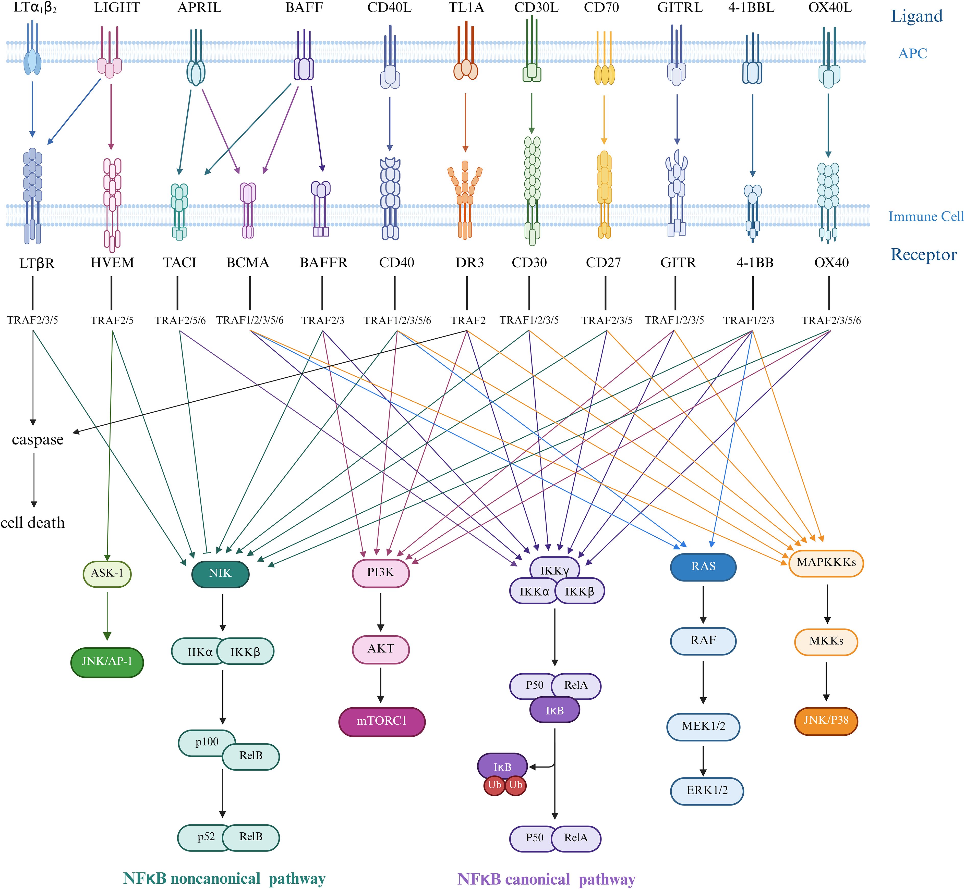 Figure 2. Ligand-receptor interactions in the TNF/TNFR superfamily and TRAF-mediated downstream signaling pathways. Ligands of the tumor necrosis factor superfamily (TNFSF) in trimeric form bind to receptors expressed as transmembrane proteins on two distinct but interacting cells—the upper representing the antigen-presenting cell (APC) membrane and the lower the immune cell membrane. The tumor necrosis factor receptor superfamily (TNFRSF) engages various TNF receptor-associated factor (TRAF) proteins to initiate downstream signaling cascades. In canonical NF-κB signaling, upstream signals recruit the IKK complex (comprising IKKα, IKKβ, and regulatory subunit IKKγ/NEMO). Activated IKKα and IKKβ phosphorylate the inhibitory protein IκBα, triggering its ubiquitination and proteasomal degradation. This releases the p50/RelA heterodimer, which translocates to the nucleus to function as a transcription factor, inducing target gene expression, predominantly regulating cell survival, inflammatory responses, and immune activation. In contrast, non-canonical NF-κB signaling is initiated by receptors such as CD40, RANK, LTβR, and BAFF-R, which activate NF-κB-inducing kinase (NIK). NIK subsequently phosphorylates and activates IKKα, mediating proteolytic processing of p100 into p52. The resultant p52/RelB complex translocates to the nucleus to regulate genes critical for lymphocyte development, survival, maturation, and adhesion.ERK1/2 promotes smooth muscle cell (SMC) migration and fibrous cap thickening, while JNK/p38 drives inflammatory cytokine and matrix metalloproteinase (MMP) expression, leading to plaque degradation and macrophage apoptosis. AP-1 integrates signals from multiple pathways to amplify inflammatory responses. mTORC1 suppresses autophagy, increases reactive oxygen species (ROS) production, and enhances lipid synthesis in both SMCs and macrophages, thereby promoting foam cell formation. The NF-κB transcription factor critically mediates inflammatory responses and cell death mechanisms in atherosclerosis pathogenesis. Created in https://BioRender.com.