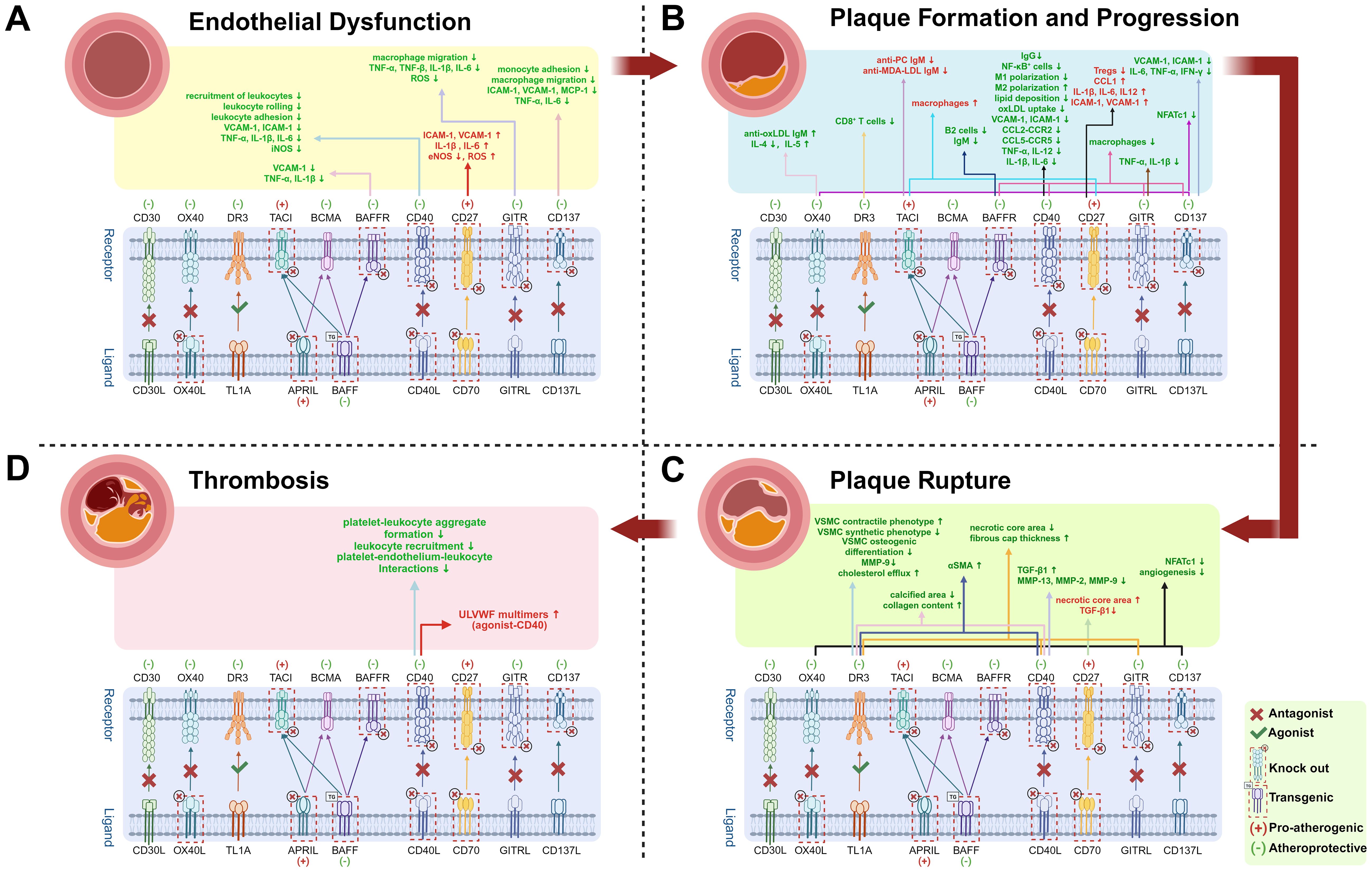 Figure 3. Effects of TNF superfamily member knockout or antagonists in Atherosclerosis. Up arrows (↑) indicate increases, and down arrows (↓) indicate decreases. Red “(+)” and text denote pro-atherogenic effects; green “(−)” and text denote atheroprotective effects. Text in red highlights molecules or cells that promote atherosclerosis; green text indicates inhibition. Atherosclerosis progresses through four stages. (A) Endothelial Dysfunction: Partial TNF superfamily knockout or antagonists reduce chemokine expression, including vascular cell adhesion molecule-1 (VCAM-1), intercellular adhesion molecule-1 (ICAM-1), and monocyte chemoattractant protein-1 (MCP-1), thereby suppressing leukocyte recruitment, rolling, and adhesion. Downregulated tumor necrosis factor-alpha (TNF-α), interleukin-1 beta (IL-1β), interleukin-6 (IL-6), and reactive oxygen species (ROS) production mitigate endothelial inflammation and oxidative stress; (B) Plaque Formation and Progression: Inhibiting pathways such as CD40, GITR, and CD137 decreases macrophage infiltration and downregulates chemokine and pro-inflammatory cytokines expression. Elevated anti-oxidized low-density lipoprotein immunoglobulin M (anti-oxLDL IgM) levels confer atheroprotection. CD40-CD40L blockade further drives M1-to-M2 macrophage polarization (M1/M2 polarization), shifting pro-inflammatory macrophages toward an anti-inflammatory phenotype. Nuclear factor of activated T cells; cytoplasmic 1 (NFATC1) promotes inflammation by regulating pro-inflammatory cytokine production; (C) Plaque Rupture: Inhibition of CD40 and GITR pathways stabilizes plaques-characterized by increased collagen content, thicker fibrous caps, smaller necrotic cores, reduced calcification, and higher numbers of αSMA-positive smooth muscle cells (SMCs). Pathway inhibition also reduces secretion of matrix metalloproteinase-9 (MMP-9), MMP-2, and MMP-13, thereby preserving fibrous cap integrity. Additionally, blocking CD137 and OX40-related pathways suppresses neovascularization and can further reduce NFATC1, which modulates SMC proliferation and calcification;. (D) Thrombosis: Activation of CD40 mediates elevated ultra-large von Willebrand factor (ULVWF) levels, increasing thrombotic risk. Conversely, inhibition of the CD40-CD40L pathway suppresses thrombosis by reducing platelet-leukocyte aggregate formation, leukocyte recruitment, and platelet-endothelium-leukocyte interactions-thereby lowering the risk of atherosclerosis complications such as stroke. Created by https://BioRender.com. (Complete data are shown in Table 1).