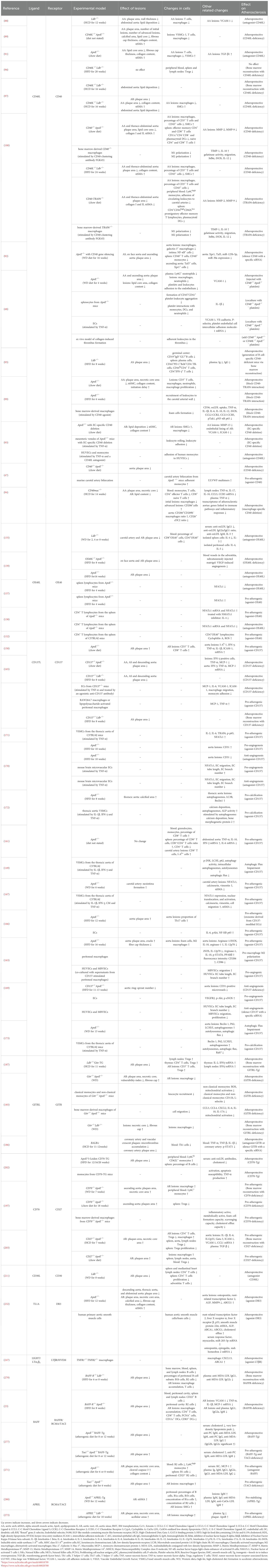 The ligand-receptor interactions within the TNF superfamily are pivotal for co-stimulatory immune signaling. Other TNF superfamily members also critically regulate immune homeostasis, apoptosis, and inflammation, all of which contribute to atherosclerosis pathogenesis.