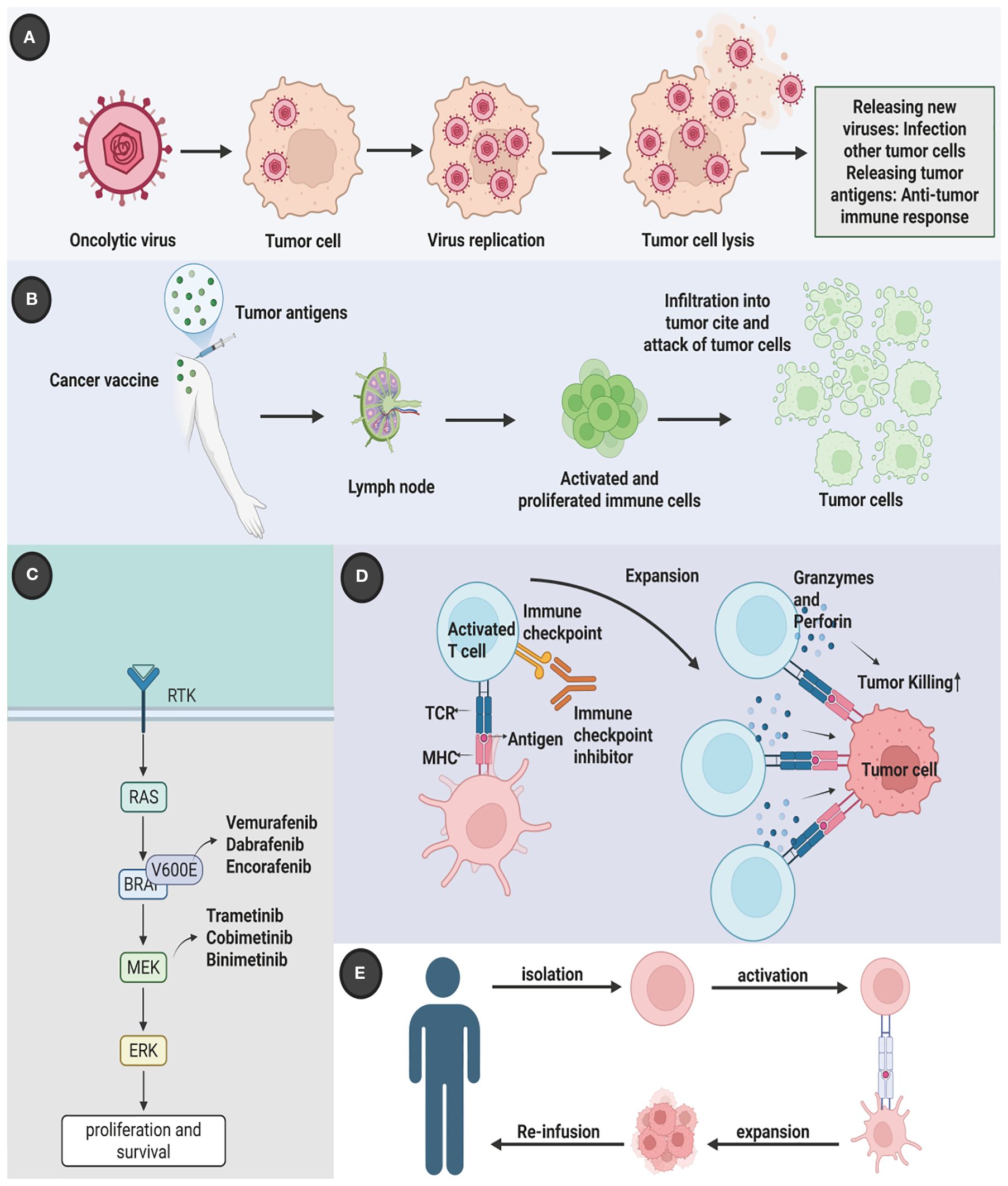 Figure 1. Multidimensional therapeutic innovation in melanoma: integrating molecular targeting, immune modulation, and biological precision. Contemporary melanoma management has evolved beyond conventional therapies to incorporate five strategic dimensions. (A) Molecular-targeted interventions counter oncogenic MAPK pathway activation through BRAF/NRAS mutation suppression; (B) Dual immune checkpoint blockade disrupts CTLA-4/B7-mediated T-cell anergy and PD-1/PD-L1-driven immune evasion, synergistically restoring antitumor surveillance; (C) Adoptive TIL therapy leverages ex vivo expanded tumor-reactive lymphocytes for precision tumor eradication; (D) Oncolytic virotherapy employs ICP34.5-deleted HSV-1 (T-VEC) for selective intralesional oncolysis; (E) Next-generation vaccine platforms coordinate cellular and nucleic acid vectors to establish durable tumor-specific immunity through effector T-cell activation and memory formation. This therapeutic matrix demonstrates enhanced tumor selectivity and reduced systemic toxicity compared to traditional cytotoxic approaches. Created by Biorender.com.