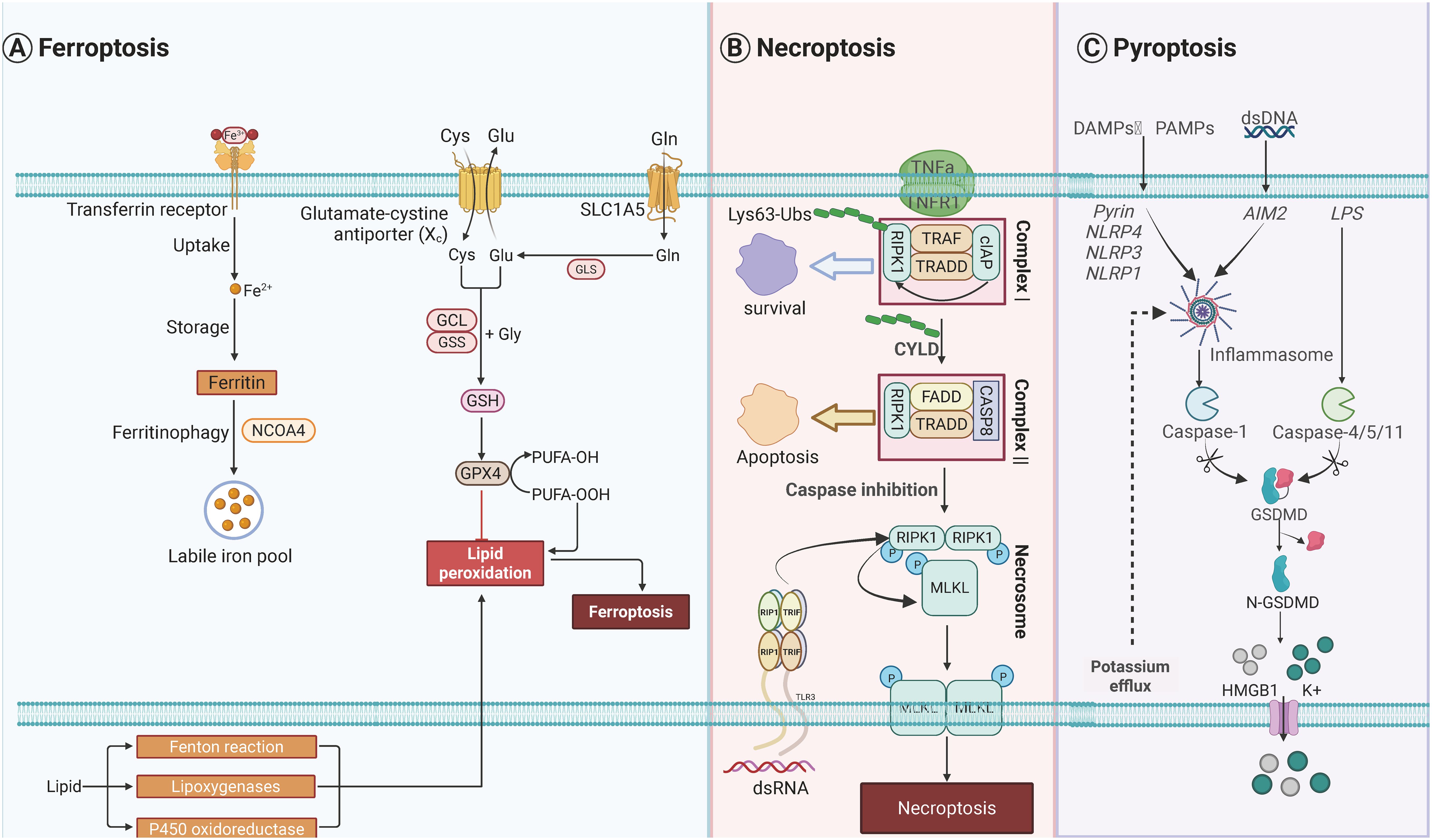 Figure 2. Molecular orchestrations governing three distinct programmed cell death modalities. (A) Pyroptotic signaling pathways are initiated through pattern recognition receptors including NLR family sensors (NLRP1/3/4), AIM2 detectors, and Pyrin proteins upon detecting pathogenic or danger signals. These sensors nucleate ASC-mediated inflammasome assembly, facilitating caspase-1 activation. Non-canonical pathway activation occurs through cytoplasmic LPS recognition by inflammatory caspases (CASP4/5/11). Both pathways converge on gasdermin-D proteolysis, generating pore-forming N-terminal fragments that execute lytic cell death. Concomitant potassium ion efflux during membrane permeabilization promotes HMGB1 liberation and extracellular potassium elevation. (B) Ferroptotic cell demise arises from dual metabolic dysregulation: iron homeostasis disruption and peroxidative membrane damage. Intracellular iron overload is mediated through enhanced TFRC-mediated uptake, impaired ferroportin export, and ferritin degradation via autophagy-lysosomal pathways. Lipid peroxidation cascades are driven by ACSL4-LPCAT3 enzymatic coupling facilitating ALOX-mediated polyunsaturated fatty acid oxidation, with RAB7A-regulated lipid droplet autophagy supplying peroxidation substrates. Cellular defenses against oxidative collapse include GPX4-glutathione redox cycling, AIFM2-CoQ10 antioxidant pairs, GTP cyclohydrolase-dependent radical scavenging systems, and ESCRT-III-mediated membrane repair mechanisms. (C) Necroptotic execution follows TNF receptor engagement and sequential signaling complex assembly. Initial membrane-proximal Complex I formation involves cIAP-mediated RIPK1 K63-ubiquitination, promoting NF-κB survival signaling. CYLD-dependent deubiquitination triggers cytosolic Complex II formation, where caspase-8 inhibition redirects signaling to RIPK1-RIPK3-MLKL necrosome assembly. Sequential kinase activation culminates in MLKL phosphorylation-induced oligomerization, forming plasma membrane-disrupting pores that mediate lytic cell death. Created by Biorender.com.