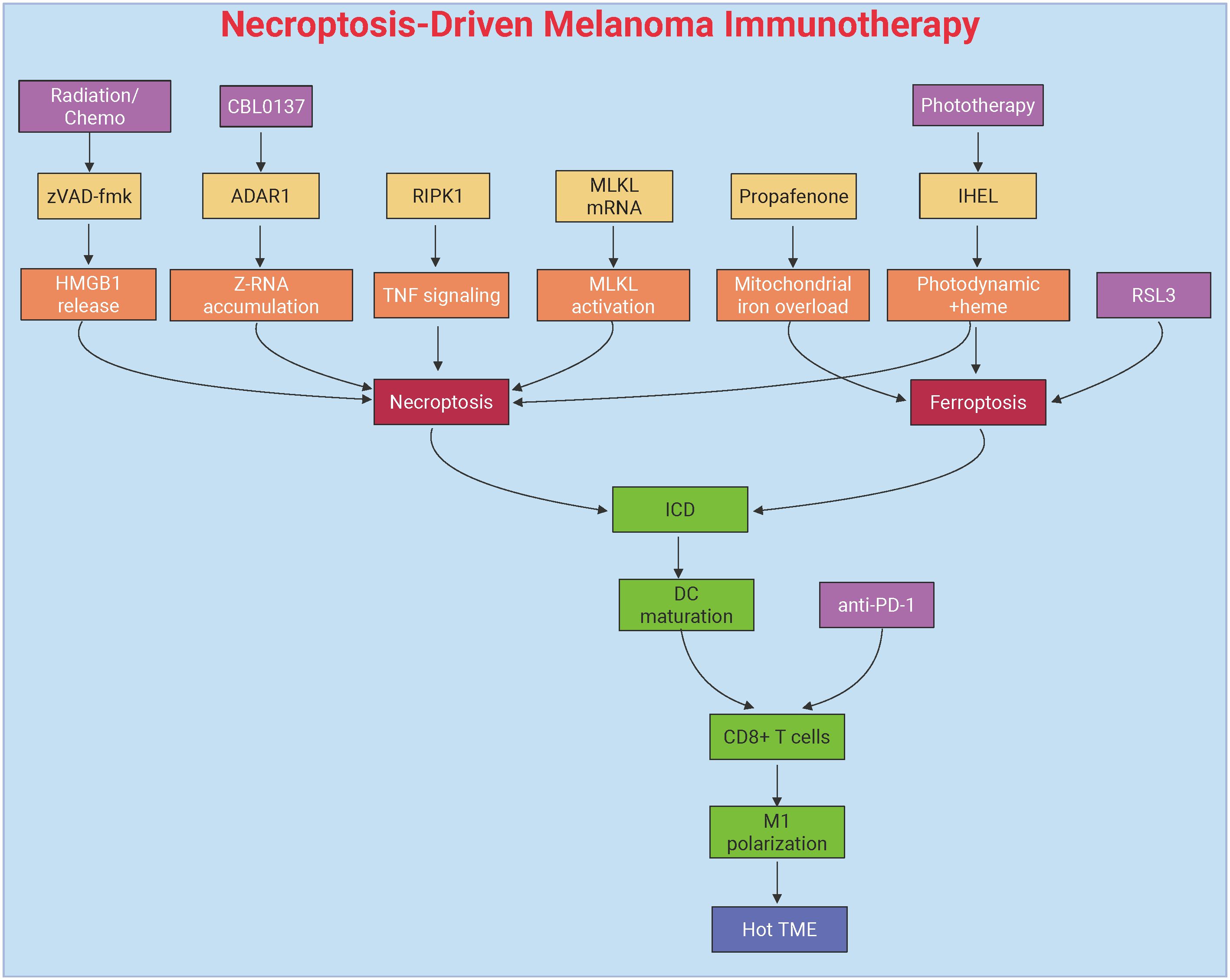 The combination of necroptosis induction with ICB represents a promising therapeutic approach for melanoma. T cell-derived TNFα has been shown to activate RIPK1-dependent necroptosis in target cells, a critical mechanism for accelerating allograft rejection and amplifying the antitumor effects of anti-PD1 therapy. In melanoma models, RIPK1-dependent necroptosis works synergistically with ICB by promoting ICD and enhancing T cell activation, thus amplifying the efficacy of ICIs (192).