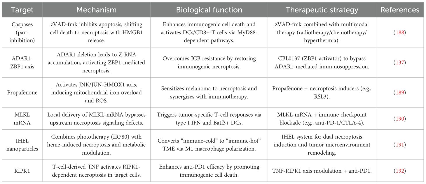 MLKL-mRNA therapy further exemplifies this synergy, as its combination with ICB leads to enhanced CD8+ T cell-mediated tumor clearance and the establishment of durable immune memory. This approach leverages both direct tumor cell killing and the priming of antitumor immunity to improve therapeutic outcomes (190). Similarly, propafenone-induced necroptosis has been shown to reshape the TME to favor ICB responsiveness. By linking necroptotic cell death with adaptive immune activation, propafenone enhances the antitumor effects of ICB therapy (189).