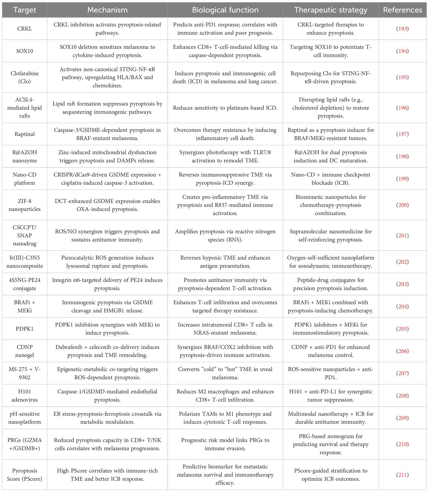 Table 3. Molecular targets and therapeutic strategies for pyroptosis-driven immunotherapy in melanoma.
