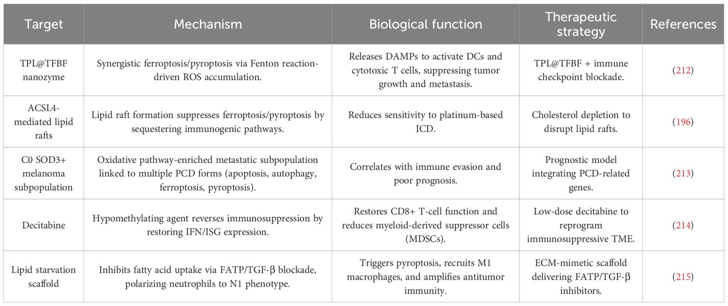 Ferroptosis, pyroptosis, and necroptosis have emerged as key regulators of tumor progression and antitumor immunity. Ferroptosis, driven by iron-dependent lipid peroxidation (LPO), enhances immunogenicity by exposing calreticulin and ATP, which promote antigen presentation and the activation of immune cells. Pyroptosis, mediated by gasdermin (GSDM) pore formation, triggers the release of pro-inflammatory cytokines, facilitating CD8+ T cell infiltration and amplifying Th1 immune responses (20–22). Necroptosis, initiated by Receptor-Interacting Protein Kinase 1 (RIPK1)/RIPK3-MLKL signaling, leads to the release of High Mobility Group Box 1 (HMGB1) and supports cross-presentation of tumor antigens, thus linking cell death to immune surveillance. In melanoma, these pathways are frequently dysregulated, with ferroptosis and pyroptosis playing a role in tumor suppression, while necroptosis may contribute to chronic inflammation and immune evasion. The ability of these lytic forms of programmed cell death (PCD) to modulate immune responses highlights their therapeutic potential in cancer immunotherapy (23, 24). By inducing immunogenic cell death (ICD), ferroptosis, pyroptosis, and necroptosis can reshape the tumor microenvironment (TME) to enhance the efficacy of immune checkpoint inhibitors (ICIs). For example, ferroptosis can deplete immunosuppressive regulatory T cells (Tregs) and myeloid-derived suppressor cells (MDSCs), while pyroptosis recruits neutrophils and activates macrophages, transforming immunologically “cold” tumors into inflamed niches (24–27). Necroptosis further promotes antigen spreading and the formation of durable T cell memory. Despite preclinical advances, challenges remain in translating these findings to the clinic due to issues such as off-target toxicity, tumor metabolic plasticity, and the need for predictive biomarkers (28, 29). However, future strategies that combine Regulated Cell Death (RCD) inducers with immune checkpoint blockade (ICB) and use innovative technologies, such as tumor-penetrating nanocarriers, hold great promise for overcoming resistance and improving therapeutic outcomes in melanoma.