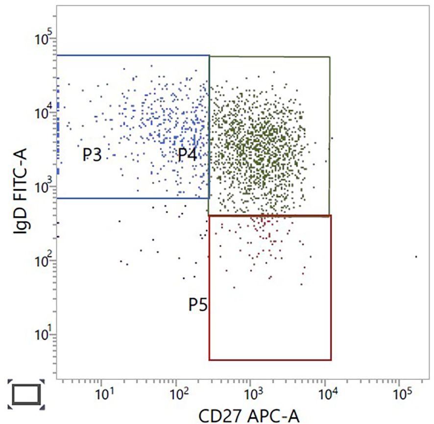 Figure 4. B-cell immunophenotyping gated on CD19, CD27-positive B cells. CD27-positive, IgD-positive non-class switched memory B cells in green, upper right panel.
