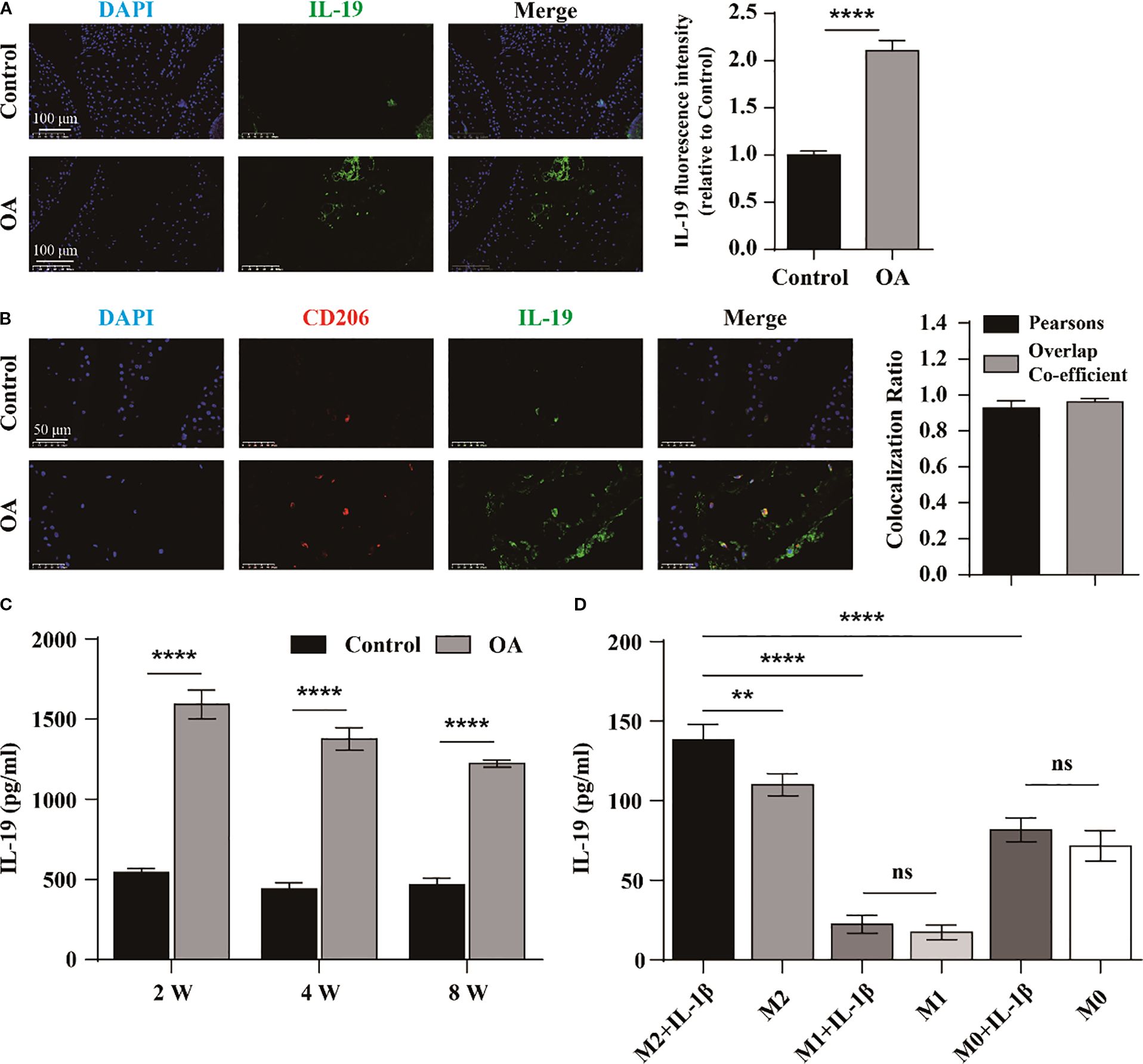 Figure 1. IL-19 is upregulated in M2 macrophages in OA mice. (A) Immunofluorescence staining and immunofluorescence intensity statistical analysis of IL-19 in mouse joint synovium. scale bar: 100 μm. (B) Immunofluorescence staining and co-localization analysis of IL-19 and CD206 in mouse joint synovium. scale bar: 50 μm. (C) ELISA detection of IL-19 concentration in mouse serum. (D) ELISA detection of IL-19 concentration in various groups of cell supernatant. The data in each panel represent the means ± SD and p values were obtained by Student’s two-tailed unpaired t test (A, C) and ANOVA test (D), ** p < 0.01, *** p < 0.001, **** p < 0.0001, ns: non-significant.