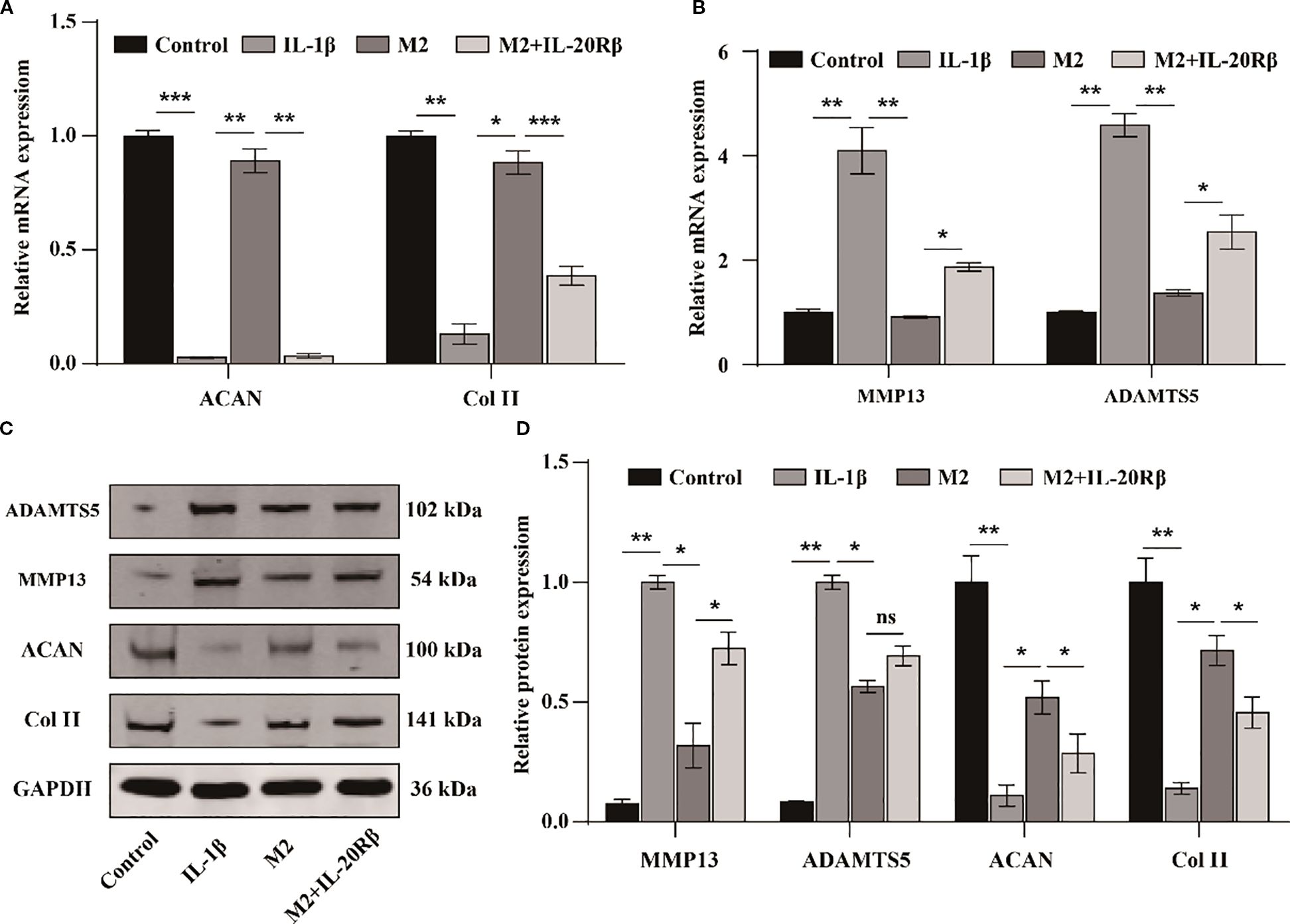 Figure 2. M2 macrophages derived IL-19 inhibits IL-1β induced degradation of extracellular matrix of chondrocytes. (A) QPCR detection of mRNA expression of ACAN and Col II. (B) QPCR detection of mRNA expression of MMP13 and ADAMTS5. (C) Western blot detection of protein expression of ACAN, Col II, MMP13 and ADAMTS5. (D) Western blot band semi quantitative analysis. The data in each panel represent the means ± SD and p values were obtained by ANOVA test, * p < 0.05, ** p < 0.01, *** p < 0.001, ns: non-significant.