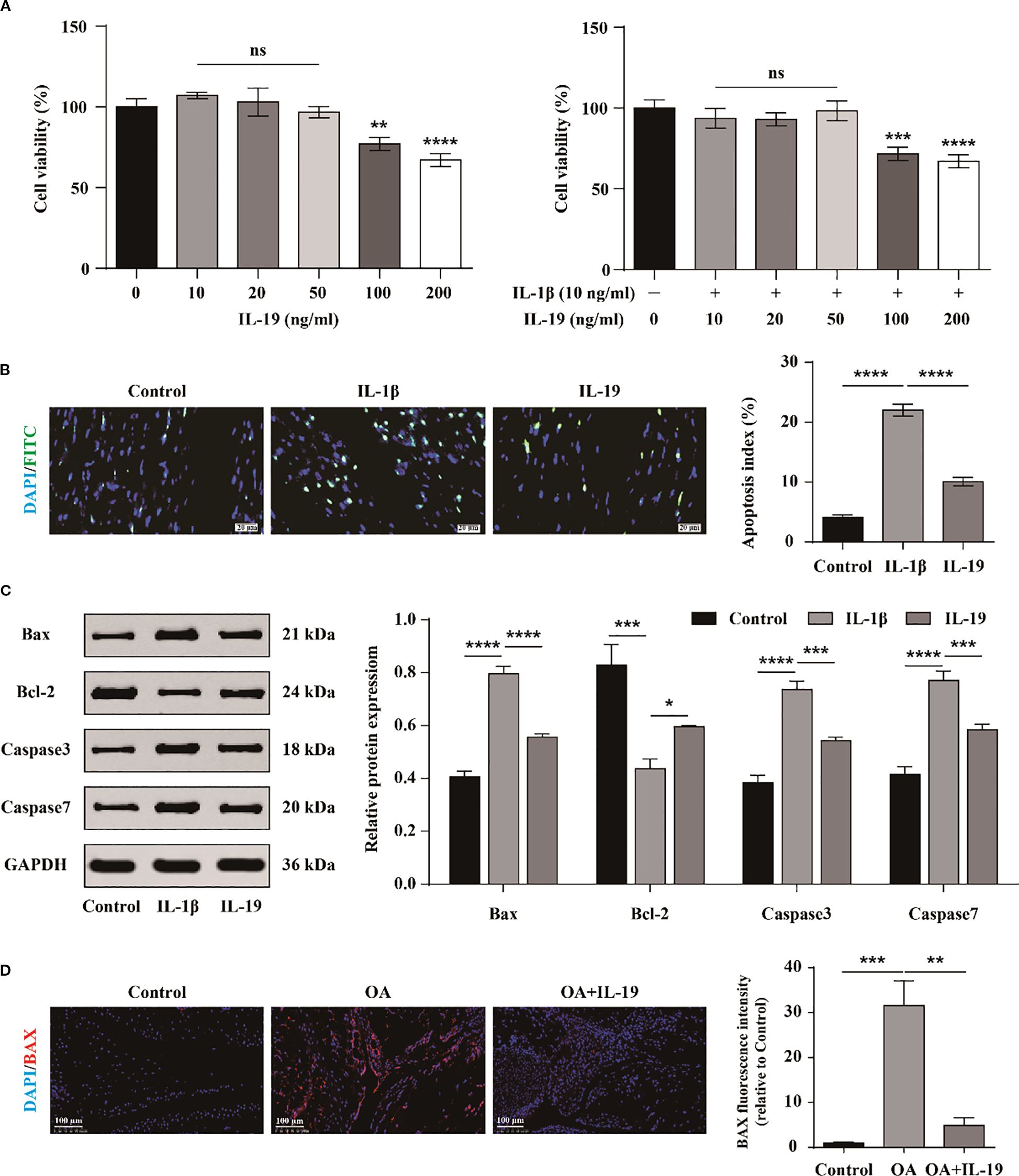 Figure 3. The inhibitory effect of IL-19 on the apoptosis of chondrocyte. (A) CCK-8 detection of the growth inhibitory effect of different concentrations of IL-19 on chondrocytes treated with or without IL-1β. (B) Tunel assay for detecting cell apoptosis and apoptosis index statistical analysis. (C) Western blot detection of protein expression of Bax, Bcl-2, Caspase3, and Caspase7. (D) Immunofluorescence staining and immunofluorescence intensity statistical analysis of Bax in mouse joint synovium. scale bar: 100 μm. The data in each panel represent the means ± SD and p values were obtained by ANOVA test, * p < 0.05, ** p < 0.01, *** p < 0.001, **** p < 0.0001, ns: non-significant.