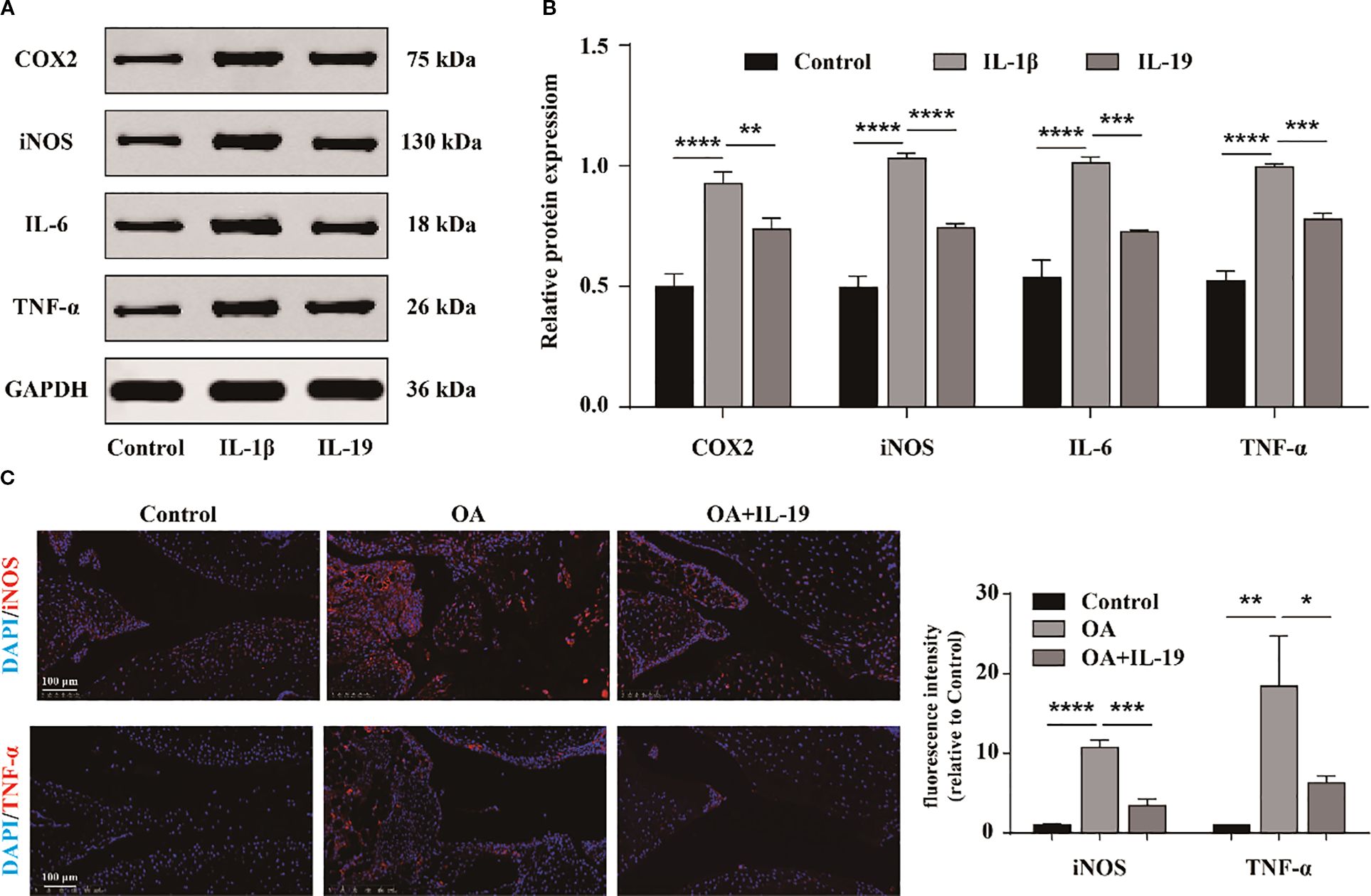 Figure 4. IL-19 inhibits the inflammatory response of chondrocytes. (A) Western blot imaging of TNF-α, IL-6, iNOS, and COX2. (B) Western blot band semi quantitative analysis. (C) Immunofluorescence staining and immunofluorescence intensity statistical analysis of TNF-α and iNOS in mouse joint synovium. scale bar: 100 μm. The data in each panel represent the means ± SD and p values were obtained by ANOVA t test, * p < 0.05, ** p < 0.01, *** p < 0.001, **** p < 0.0001.