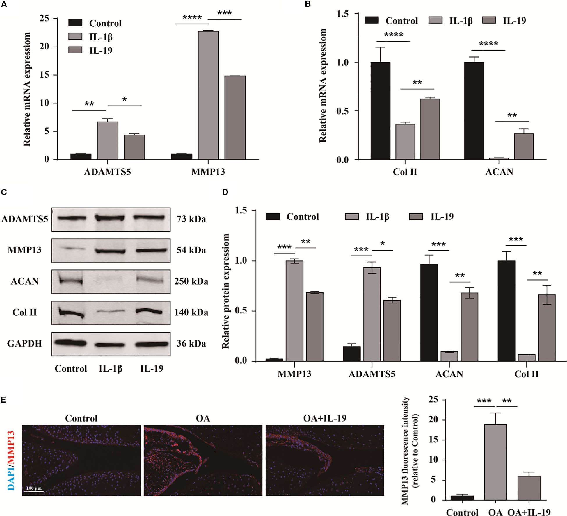 Figure 5. IL-19 inhibits cartilage matrix degradation and promotes matrix synthesis. (A) QPCR detection of mRNA expression of ADAMTS5 and MMP13. (B) QPCR detection of mRNA expression of ACAN and Col II. (C) Western blot imaging of ADAMTS5, MMP13, ACAN and Col II. (D) Western blot band semi quantitative analysis. (E) Immunofluorescence staining and immunofluorescence intensity statistical analysis of MMP13 in mouse joint synovium. scale bar: 100 μm. The data in each panel represent the means ± SD and p values were obtained by ANOVA test, * p < 0.05, ** p < 0.01, *** p < 0.001, **** p < 0.0001.