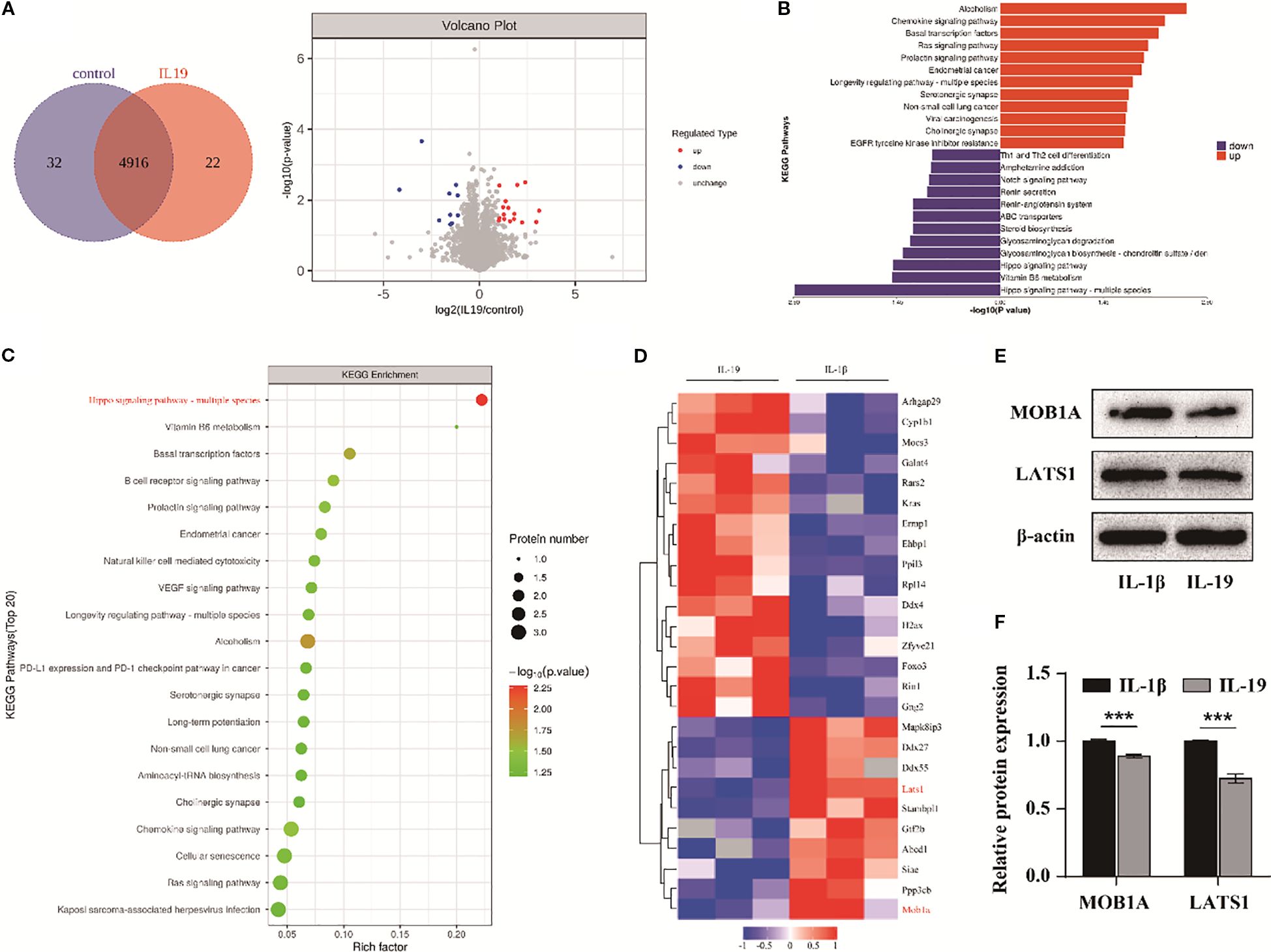 Figure 6. The Hippo signaling pathway is involved in IL-19 mediated treatment of OA. (A) Protein Venn diagram identified by proteomic sequencing and volcano diagram of differentially expressed proteins. (B) Enrichment butterfly diagram of pathways for upregulation and downregulation of differentially expressed proteins. (C) KEGG enrichment bubble diagram of differentially expressed proteins, with the horizontal axis representing the enrichment factor, bubble size representing the number of proteins, and bubble color representing the significance of enriched KEGG pathways. (D) Heatmap of significantly differentially expressed proteins. (E) Western blot detection of Hippo pathway related proteins. (F) Western blot band semi quantitative analysis. The data in each panel represent the means ± SD and p values were obtained by Student’s two-tailed unpaired t test, *** p < 0.001.