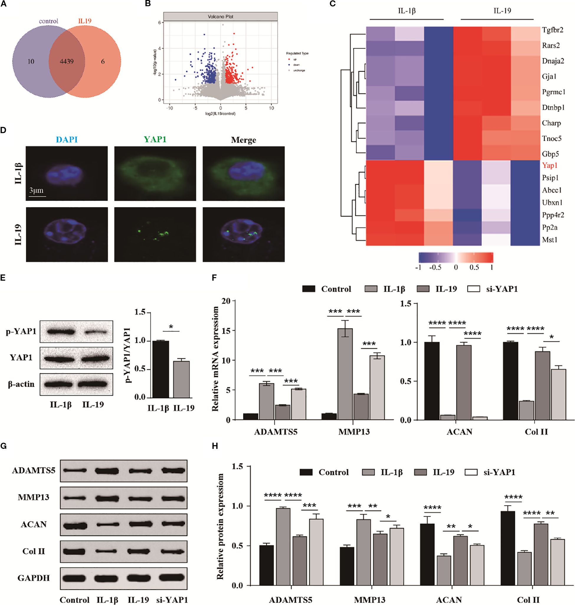 Figure 7. IL-19 inhibits the Hippo-YAP signaling pathway to slow down the progression of OA. (A) Venn diagram identified by phosphorylated proteomics sequencing. (B) Volcano diagram of differentially expressed phosphorylated peptide proteins. (C) Cluster analysis results of the top 16 most significantly different phosphorylated peptide proteins. (D) Immunofluorescence results for YAP1’s intracellular localization. (E) Western blot detection of phosphorylated YAP1 and semi quantitative analysis of p-YAP1/YAP1. (F) QPCR analysis of the effect of si-YAP1 on mRNA expression of ADAMTS5, MMP13, ACAN and Col II. (G) Western blot validation of the effect of si-YAP1 on protein expression of ADAMTS5, MMP13, ACAN and Col II. (H) Western blot band semi quantitative analysis. The data in each panel represent the means ± SD and p values were obtained by Student’s two-tailed unpaired t test (E) and ANOVA test (F, H), * p < 0.05, ** p < 0.01, *** p < 0.001, **** p < 0.0001.