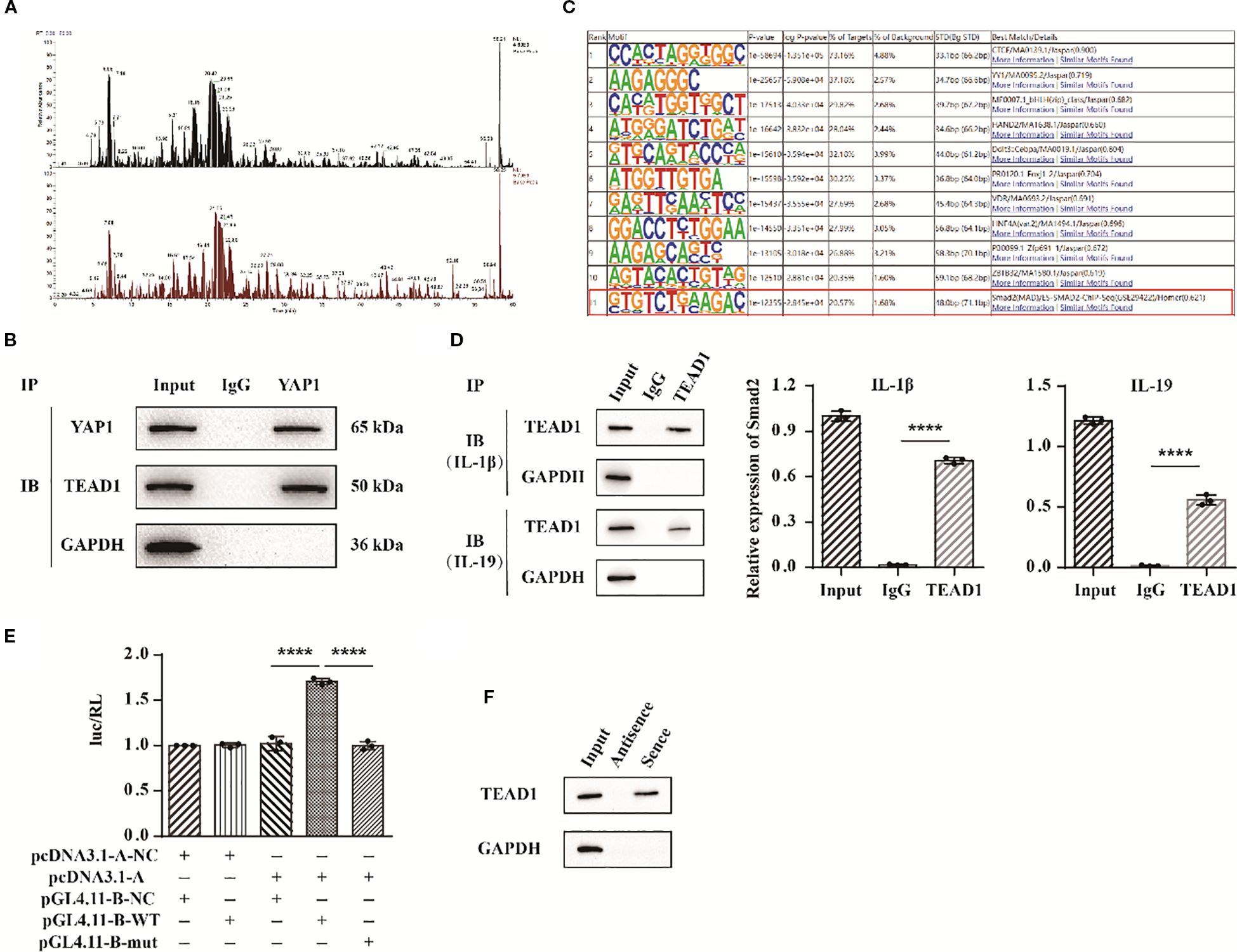 Figure 8. YAP1 targets Smad2 by interaction with TEAD1. (A) YAP1 protein mass spectrometry analysis. (B) Co-IP experimental bands of YAP1 and TEAD1. (C) ChIP-seq results of protein TEAD1. (D) ChIP-PCR results of Smad2. (E) Statistical chart of dual luciferase detection results of Smad2. (F) DNA pull down detection of TEAD1 protein bands. The data in each panel represent the means ± SD and p values were obtained by ANOVA test, **** p < 0.0001.
