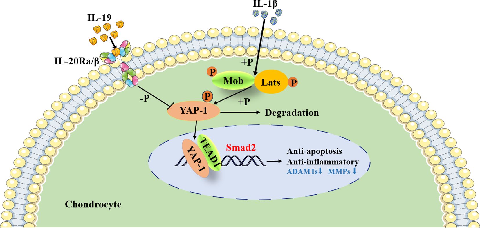 Results: This study found an elevated expression of IL-19 in the joints of OA mice and confirmed that the IL-19 in these joints primarily derives from synovial M2 macrophages. Additionally, we found that IL-19 mitigates IL-1β-induced osteoarthritis by inhibiting the Hippo signaling pathway and the phosphorylation of the YAP1 (Yes-associated protein 1) protein.