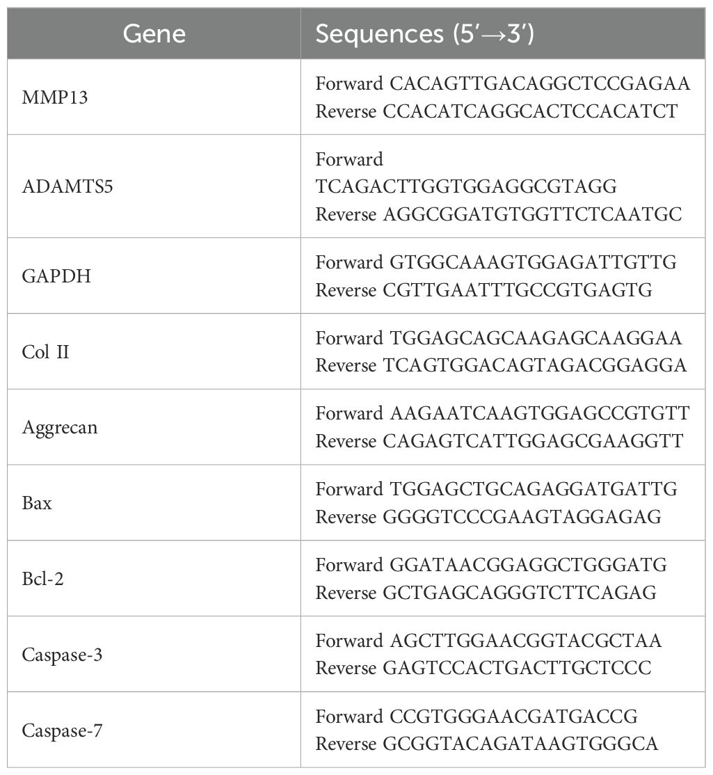 Chondrocytes were washed with cold PBS and incubated with Trizol reagent (Thermo, USA) to extract total RNA. The total RNA was quantified with a spectrophotometer at 260 nm (Thermo Scientific NanoDrop 2000), and the ratio of the absorbance at A260/A280 was used to evaluate the purity of the RNA. The cDNA was synthesized using 1 µg RNA with a PrimeScript™ RT Master Mix (Takara, Japan). Then, cDNA was subjected to RT−qPCR analysis with SYBR®Fast qPCR Mix (Takara, Japan) by CFX96 Real−Time PCR system (Bio−Rad) under conditions of 94 °C for 30 sec, followed by 40 cycles at 95 °C for 5 sec and 60 °C for 10 sec, and finally the dissociation curve of each primer pair was analyzed to determine primer specificity. Target mRNA levels were normalized to the GAPDH level. The primers are shown in Table 1.