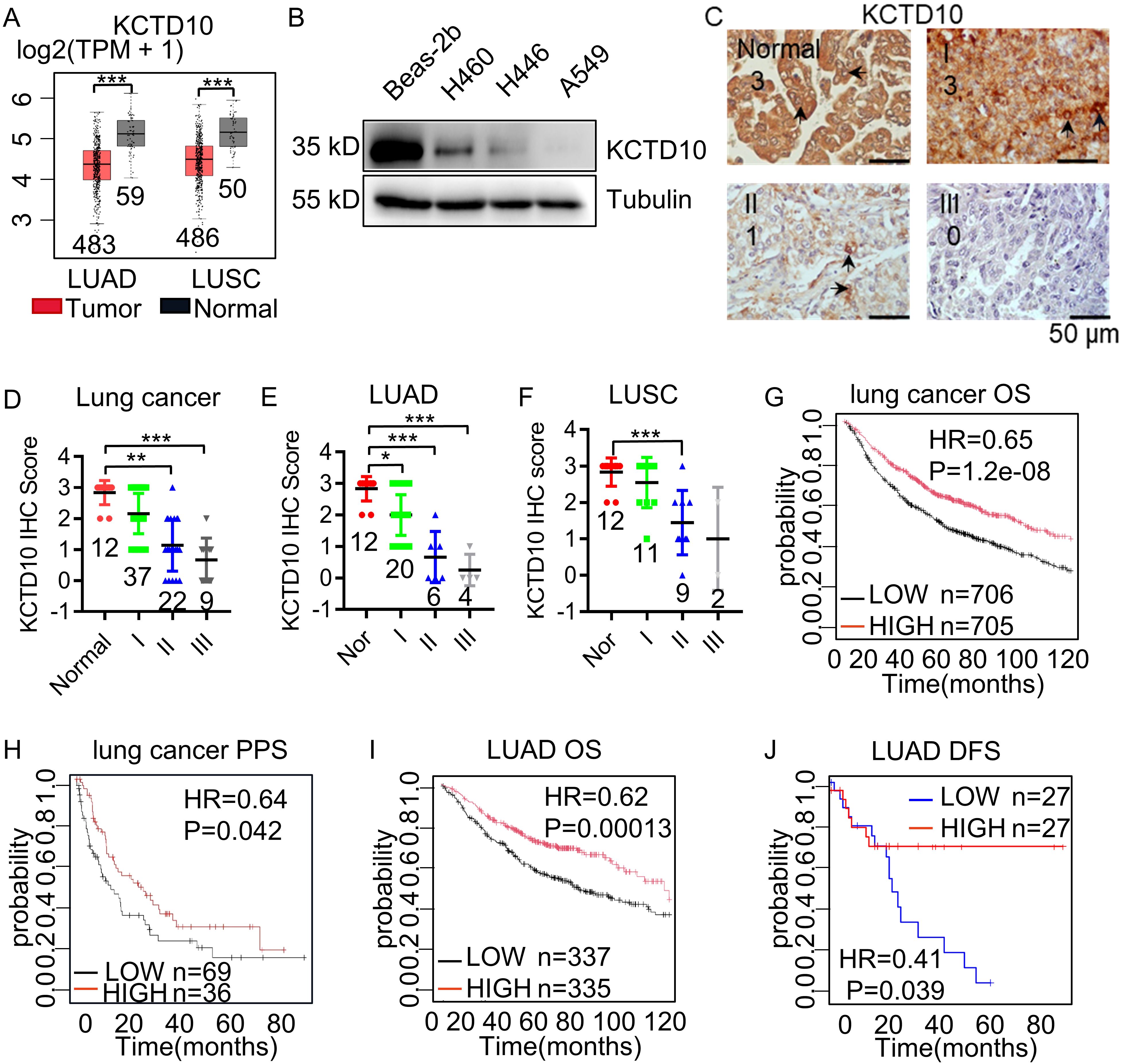 Figure 1. Low expression of KCTD10 in lung cancer. (A) GEPIA database analysis of KCTD10 expression in normal lung tissues and lung cancer tissues. (B) Western blot analysis of KCTD10 expression in lung cancer cell lines and normal cell line Bears-2b. (C, D) IHC analysis of KCTD10 expression in human lung cancer tissues (n=80) and corresponding staining scores in different lung cancer grades. (E, F) IHC analysis of KCTD10 expression in LUAD (n=42) and LUSC (n=34). (G) Correlation between KCTD10 expression and overall survival in lung cancer patients, HR=0.65 (0.55-0.75), logrank P=1.2e-08. (H) Correlation between KCTD10 expression and post-progression survival of lung cancer patients, HR=0.64 (0.42-0.99), logrank P=0.042. (I) Correlation between KCTD10 expression and overall survival in LUAD patients, HR=0.62 (0.48-0.79), logrank P=0.00013. (J) Correlation between KCTD10 expression and disease free survival in LUAD patients, HR=0.41 (0.35-0.47), logrank P=0.042. *P < 0.05, **P < 0.01, ***P < 0.001.