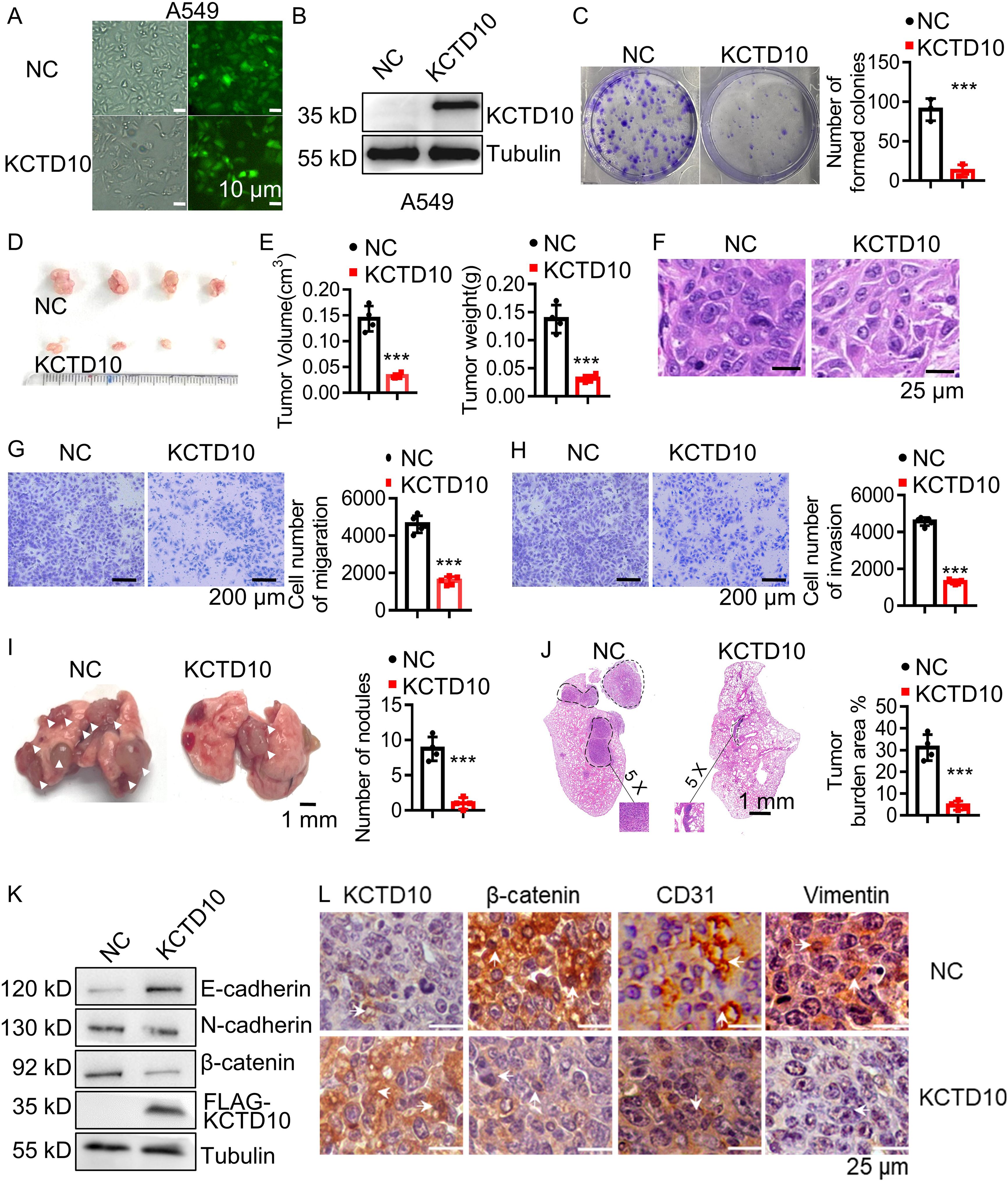 Figure 2. Overexpression of KCTD10 inhibits lung cancer growth and metastasis in vitro and in vivo. (A) Fluorescence image showing the efficiency of lentiviral infection in A549 cells. (B) Western blot analysis confirming KCTD10 overexpression in A549 cells. (C) Colony formation assays demonstrating the effect of KCTD10 overexpression on cell growth. (D, E) Effects of KCTD10 on the weight and volume of subcutaneous A549 tumors (n=4/group). (F) Effects of KCTD10 on cell morphology of A549 subcutaneous tumors. (G, H) Transwell assays evaluating the effect of KCTD10 overexpression on A549 cell migration and invasion. (I, J) Effect of KCTD10 overexpression on lung colonization of A549 cells injected via the tail vein (n=4). 5x105 A549 cells and KCTD10-overexpressing A549 cells were injected. (K, L) Western blot and IHC analysis of EMT-related gene expression. ***P< 0.001.