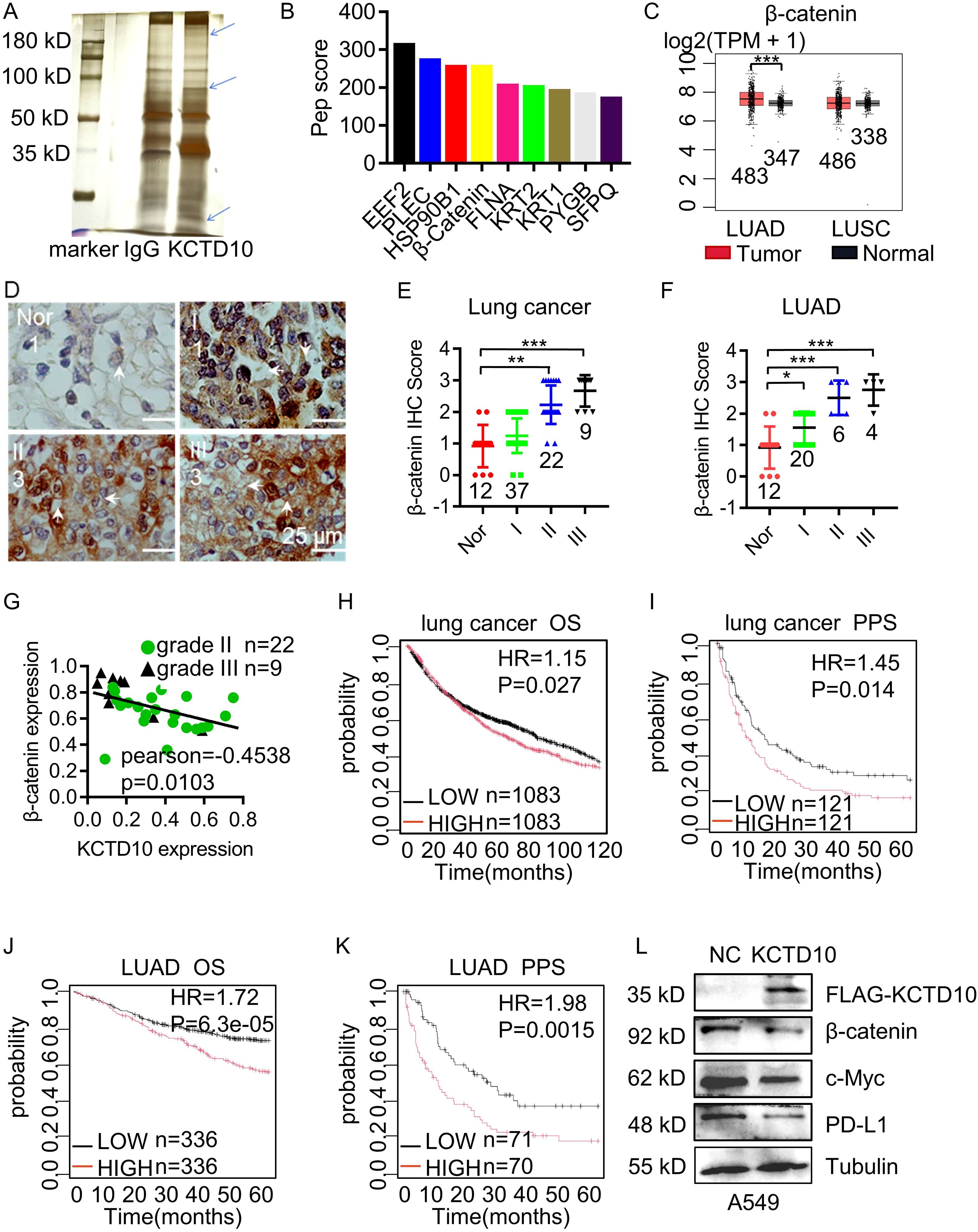 Figure 3. Interaction between KCTD10 and β-catenin proteins. (A) IP-MS and silver staining showing differential bands between anti-KCTD10 antibodies and IgG. (B) The top nine polypeptide scores of KCTD10-interacting proteins. (C) GEPIA database analysis of β-catenin expression in normal and lung cancer tissues. (D, E) IHC analysis of β-catenin expression and corresponding staining scores in different lung cancer grades (n=80). (F) IHC analysis of β-catenin in LUAD (n=42). (G) Correlation between KCTD10 and β-catenin expression in lung cancer. (H–K) Correlation between β-catenin expression and overall/post-progression survival of lung cancer patients. (H) HR=1.15 (1.02-1.29), logrank P=0.027. (I) HR=1.45 (1.08-1.97), logrank P=0.014. (J) HR=1.72(1.31-2.25), logrank P=6.3e-05. (K) HR=1.98 (1.29-3.05), logrank P=0.0015. (L) Western blot analysis of β-catenin expression and its downstream genes in A549 cells. *P < 0.05, **P < 0.01, ***P < 0.001.